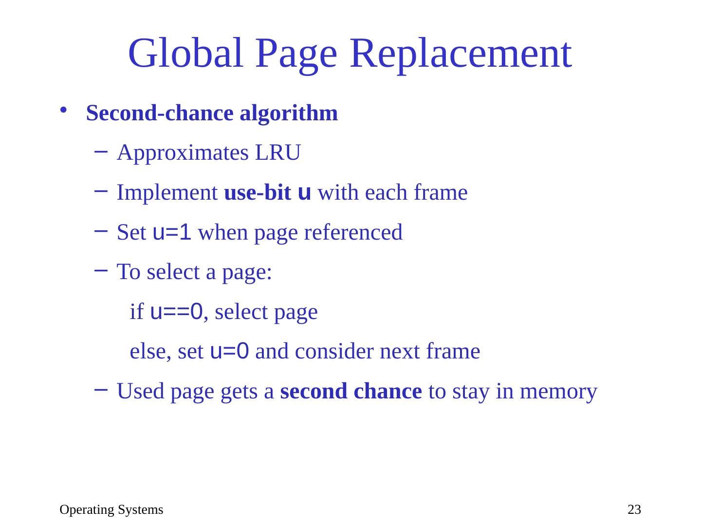 23 .Operating Systems 23 Global Page Replacement Second-chance algorithm Approximates LRU Implement use-bit u with each frame Set u=1 when page referenced To select a page: if u==0 , select page else, set u=0 and consider next frame Used page gets a second chance to stay in memory