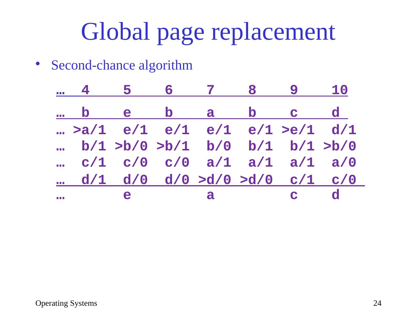 24 .Operating Systems 24 Global page replacement Second-chance algorithm … 4 5 6 7 8 9 10 … b e b a b c d … >a/1 e/1 e/1 e/1 e/1 >e/1 d/1 … b/1 >b/0 >b/1 b/0 b/1 b/1 >b/0 … c/1 c/0 c/0 a/1 a/1 a/1 a/0 … d/1 d/0 d/0 >d/0 >d/0 c/1 c/0 … e a c d