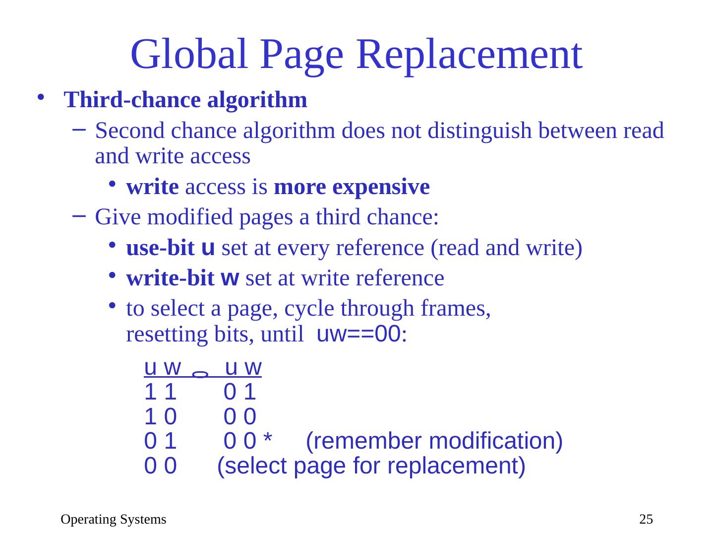 25 .Operating Systems 25 Global Page Replacement Third-chance algorithm Second chance algorithm does not distinguish between read and write access write access is more expensive Give modified pages a third chance: use-bit u set at every reference (read and write) write-bit w set at write reference to select a page, cycle through frames, resetting bits, until uw ==00 : u w u w 1 1 0 1 1 0 0 0 0 1 0 0 * (remember modification) 0 0 (select page for replacement)