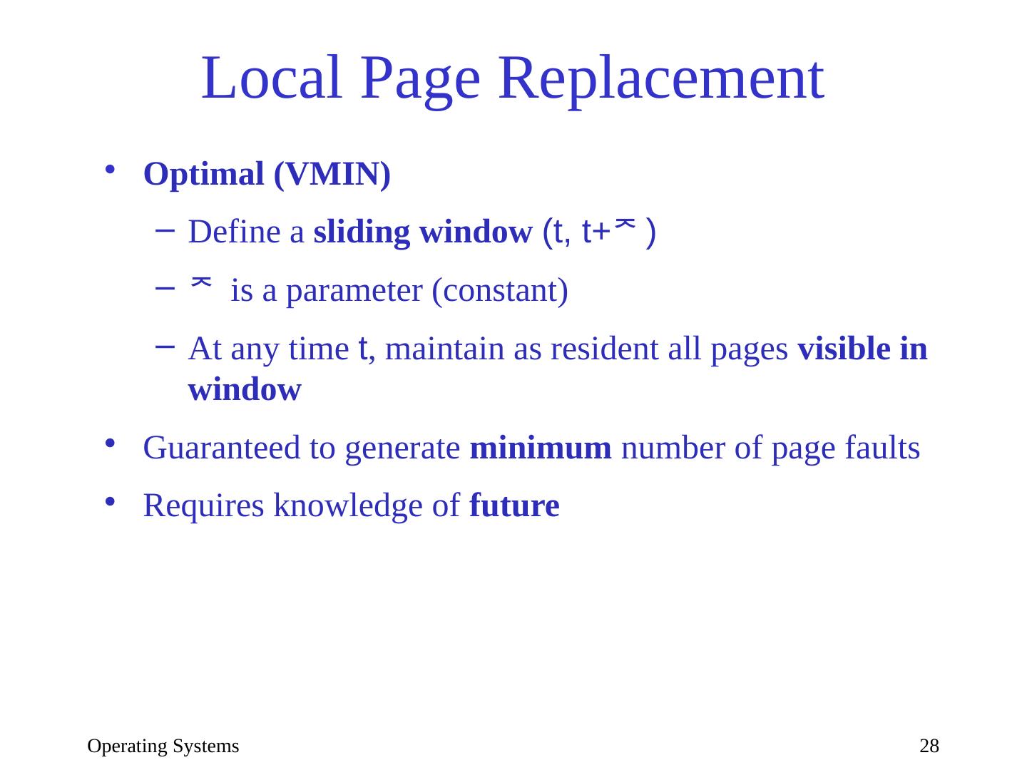 28 .Operating Systems 28 Local Page Replacement Optimal (VMIN) Define a sliding window (t, t+ ) is a parameter (constant) At any time t , maintain as resident all pages visible in window Guaranteed to generate minimum number of page faults Requires knowledge of future