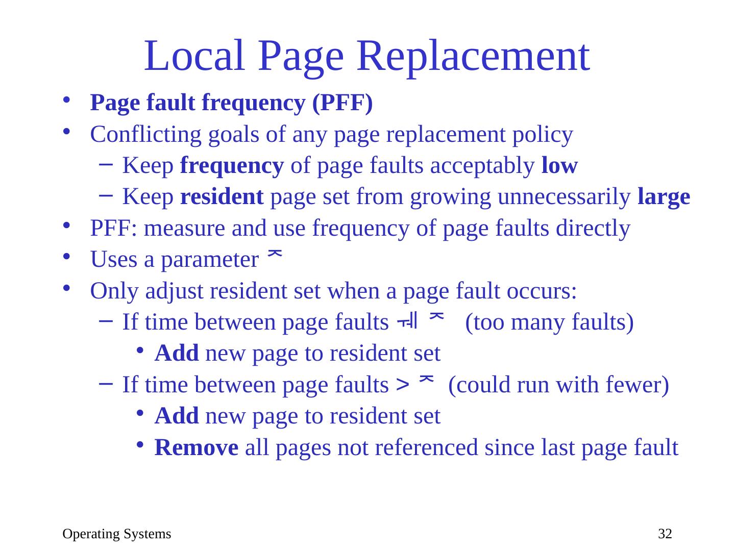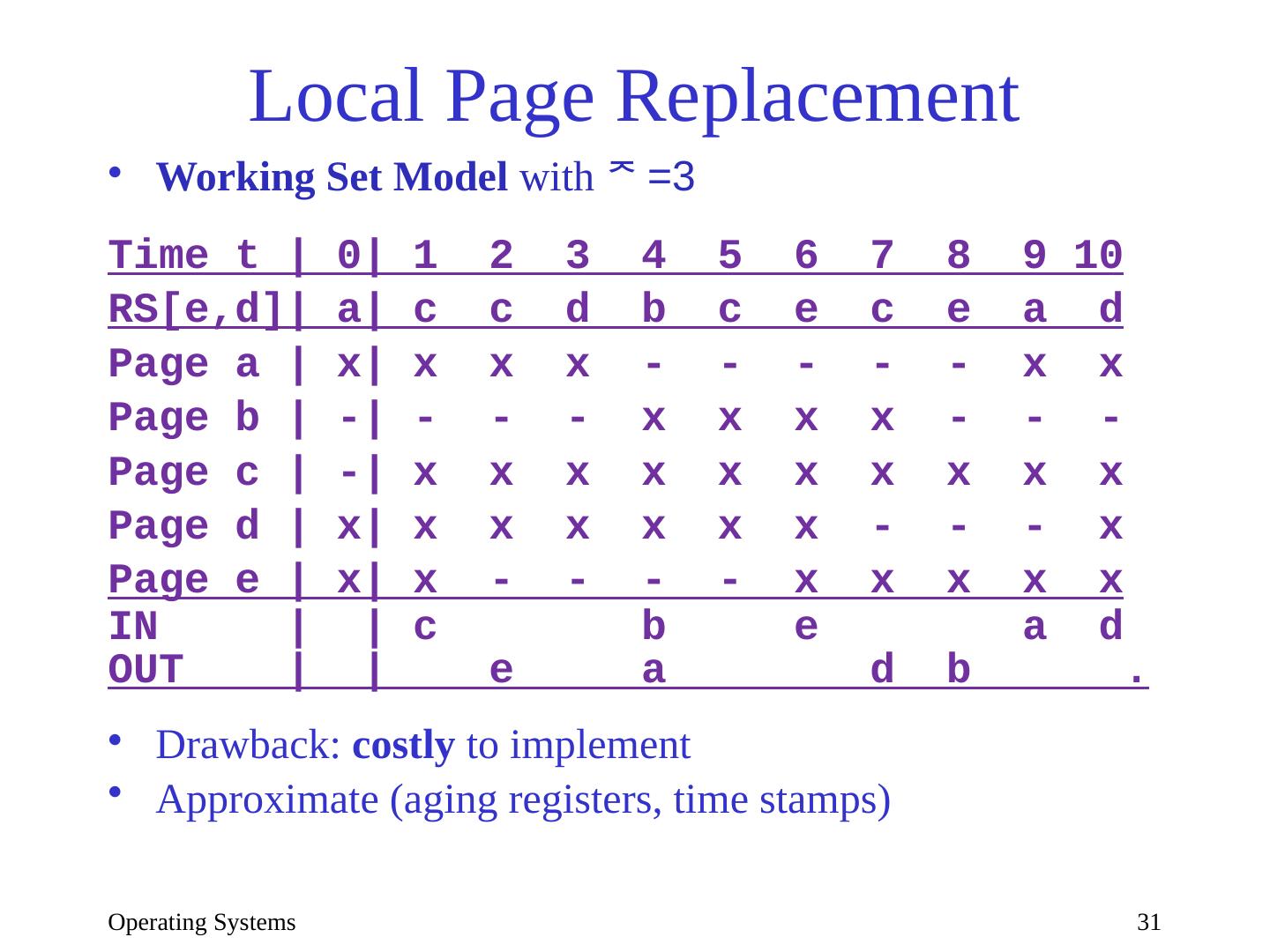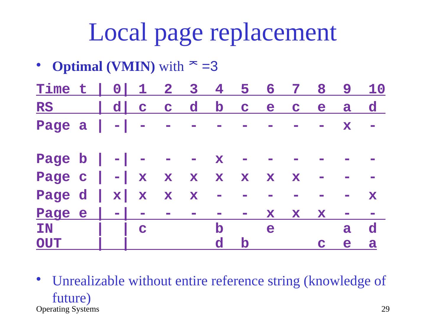 29 .Operating Systems 29 Local page replacement Optimal (VMIN) with =3 Time t | 0| 1 2 3 4 5 6 7 8 9 10 RS | d| c c d b c e c e a d Page a | -| - - - - - - - - x - Page b | -| - - - x - - - - - - Page c | -| x x x x x x x - - - Page d | x| x x x - - - - - - x Page e | -| - - - - - x x x - - IN | | c b e a d OUT | | d b c e a Unrealizable without entire reference string (knowledge of future)