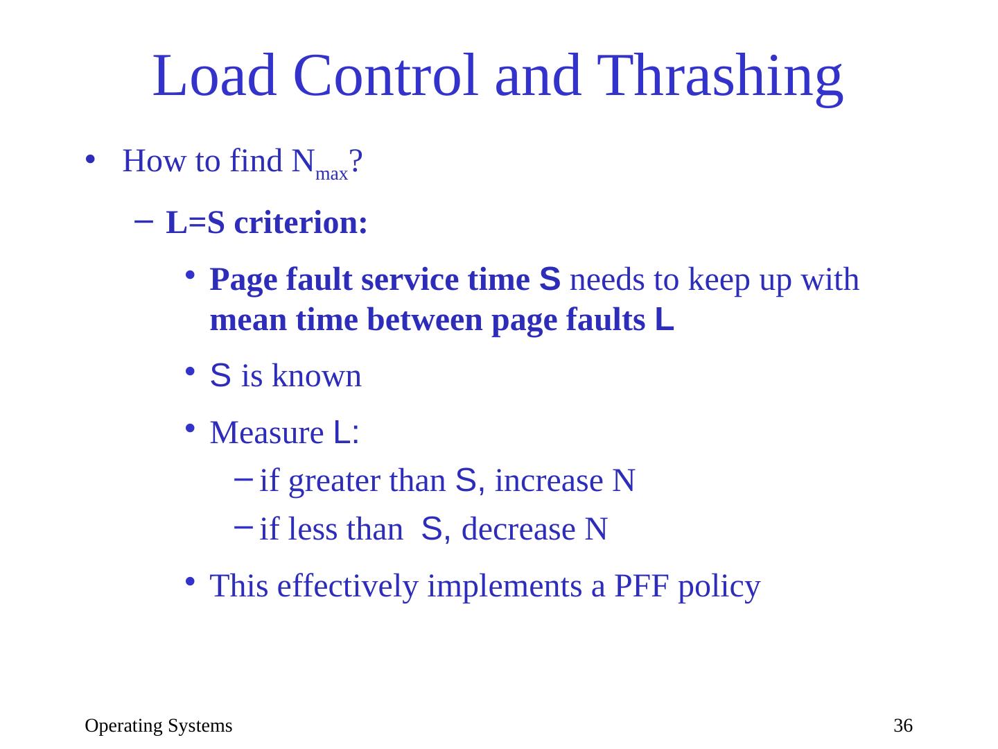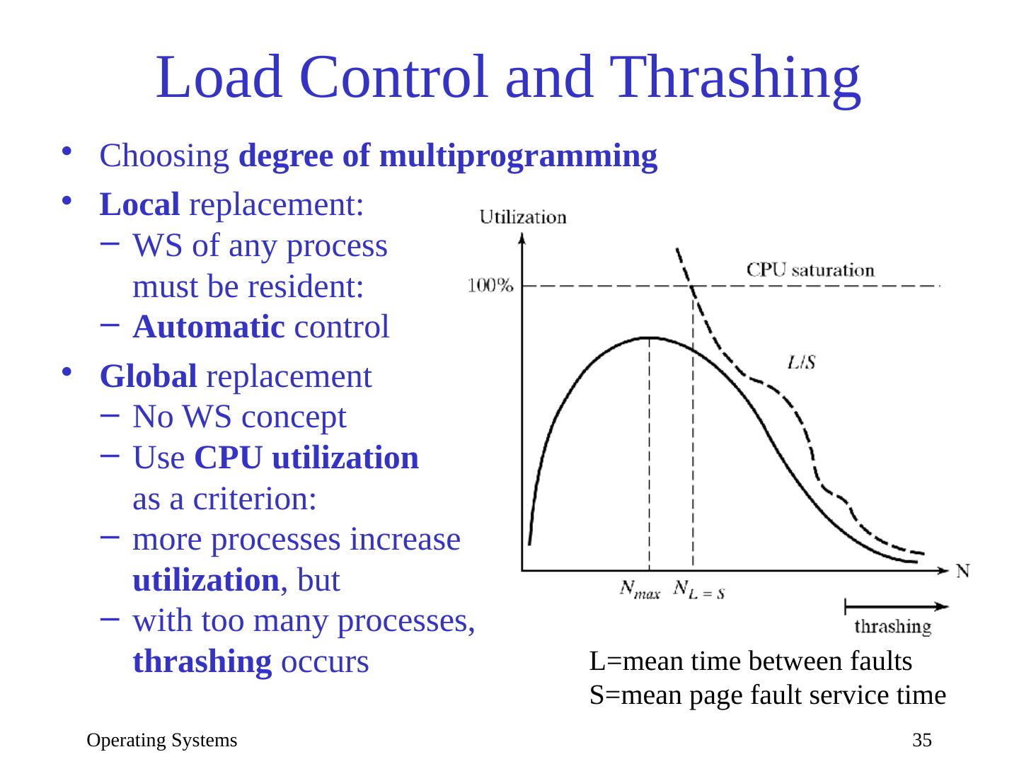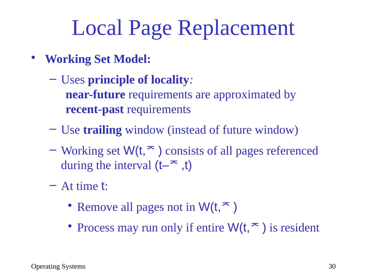 29 .Operating Systems 29 Local page replacement Optimal (VMIN) with =3 Time t | 0| 1 2 3 4 5 6 7 8 9 10 RS | d| c c d b c e c e a d Page a | -| - - - - - - - - x - Page b | -| - - - x - - - - - - Page c | -| x x x x x x x - - - Page d | x| x x x - - - - - - x Page e | -| - - - - - x x x - - IN | | c b e a d OUT | | d b c e a Unrealizable without entire reference string (knowledge of future)