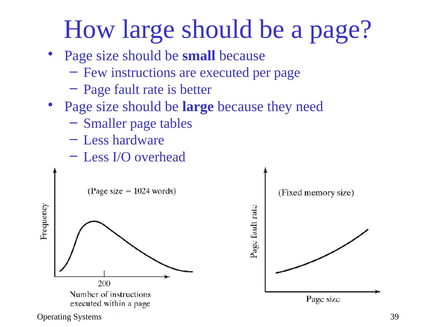 10 .Example: address translation Assume: page size = 512 words |VA| = 32 bits |PA| = 24 bits Translate the following virtual addresses to physical: 512, 30, 1024 Operating Systems 10 Page# Frame# 0: 8 1: 4 2: 0 … …