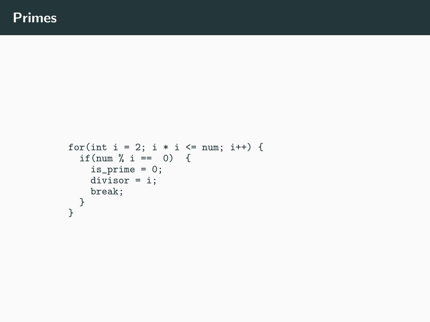 4 .Primes for(int i = 2; i * i <= num; i++) { if(num % i == 0) { is_prime = 0; divisor = i; break; } }