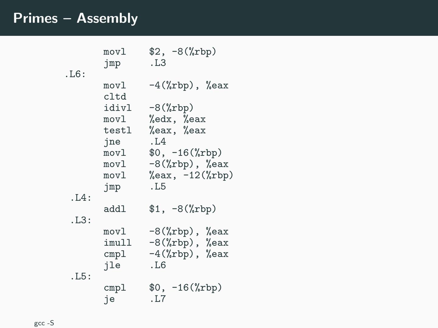 5 .Primes – Assembly movl $2, -8(%rbp) jmp .L3 .L6: movl -4(%rbp), %eax cltd idivl -8(%rbp) movl %edx, %eax testl %eax, %eax jne .L4 movl $0, -16(%rbp) movl -8(%rbp), %eax movl %eax, -12(%rbp) jmp .L5 .L4: addl $1, -8(%rbp) .L3: movl -8(%rbp), %eax imull -8(%rbp), %eax cmpl -4(%rbp), %eax jle .L6 .L5: cmpl $0, -16(%rbp) je .L7 gcc -S