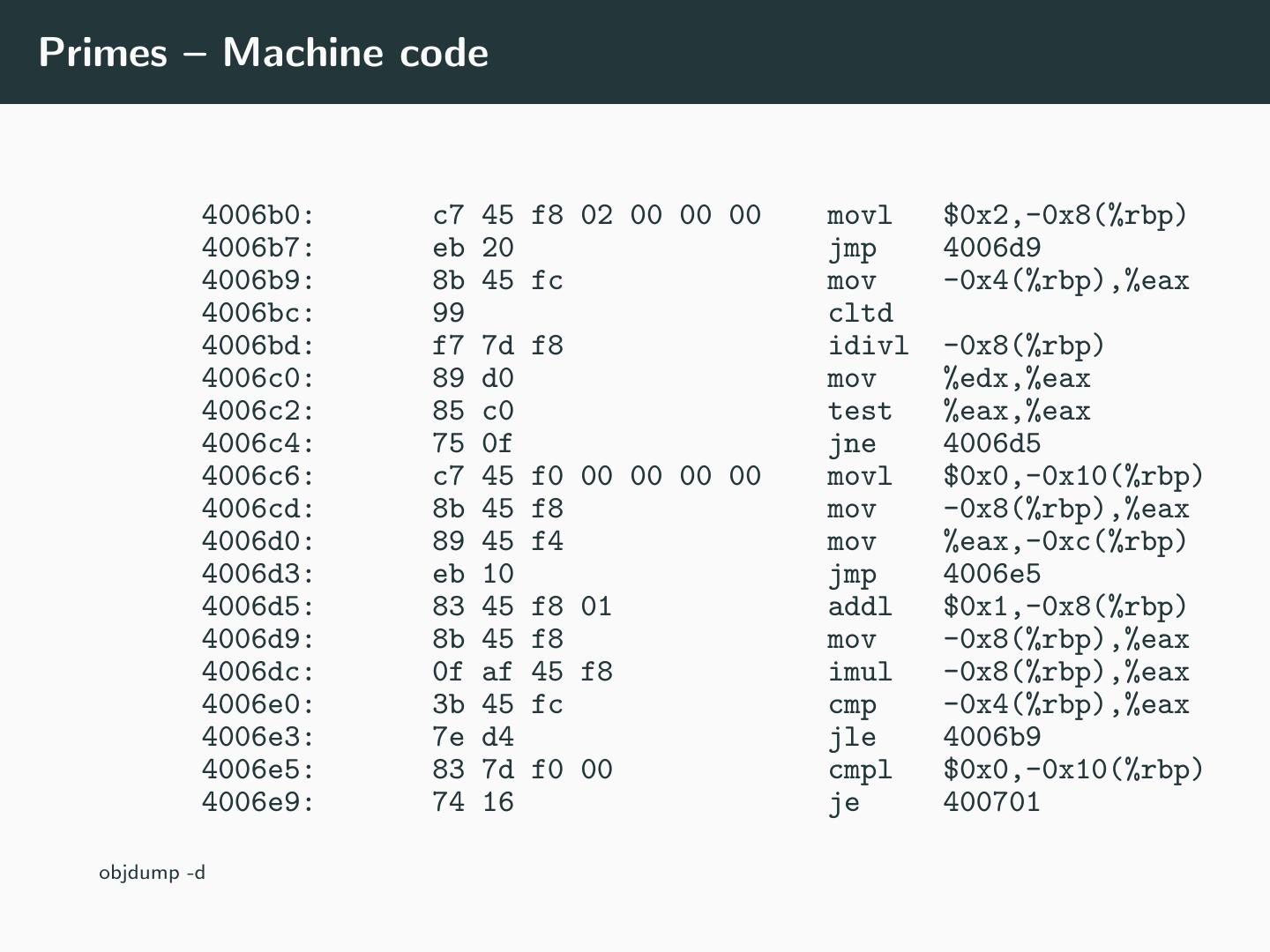 6 .Primes – Machine code 4006b0: c7 45 f8 02 00 00 00 movl $0x2,-0x8(%rbp) 4006b7: eb 20 jmp 4006d9 4006b9: 8b 45 fc mov -0x4(%rbp),%eax 4006bc: 99 cltd 4006bd: f7 7d f8 idivl -0x8(%rbp) 4006c0: 89 d0 mov %edx,%eax 4006c2: 85 c0 test %eax,%eax 4006c4: 75 0f jne 4006d5 4006c6: c7 45 f0 00 00 00 00 movl $0x0,-0x10(%rbp) 4006cd: 8b 45 f8 mov -0x8(%rbp),%eax 4006d0: 89 45 f4 mov %eax,-0xc(%rbp) 4006d3: eb 10 jmp 4006e5 4006d5: 83 45 f8 01 addl $0x1,-0x8(%rbp) 4006d9: 8b 45 f8 mov -0x8(%rbp),%eax 4006dc: 0f af 45 f8 imul -0x8(%rbp),%eax 4006e0: 3b 45 fc cmp -0x4(%rbp),%eax 4006e3: 7e d4 jle 4006b9 4006e5: 83 7d f0 00 cmpl $0x0,-0x10(%rbp) 4006e9: 74 16 je 400701 objdump -d