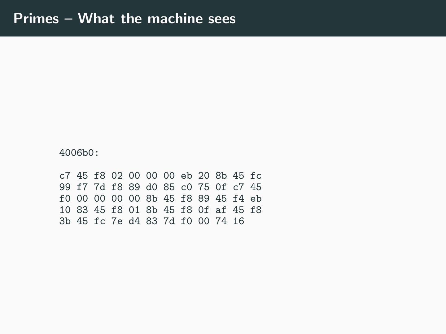 7 .Primes – What the machine sees 4006b0: c7 45 f8 02 00 00 00 eb 20 8b 45 fc 99 f7 7d f8 89 d0 85 c0 75 0f c7 45 f0 00 00 00 00 8b 45 f8 89 45 f4 eb 10 83 45 f8 01 8b 45 f8 0f af 45 f8 3b 45 fc 7e d4 83 7d f0 00 74 16