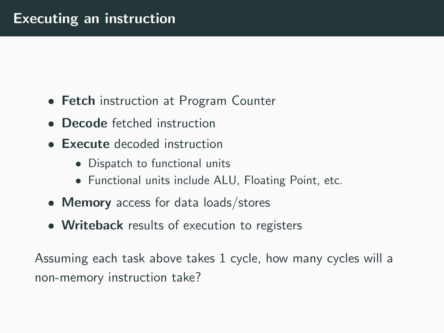 8 .Executing an instruction • Fetch instruction at Program Counter • Decode fetched instruction • Execute decoded instruction • Dispatch to functional units • Functional units include ALU, Floating Point, etc. • Memory access for data loads/stores • Writeback results of execution to registers Assuming each task above takes 1 cycle, how many cycles will a non-memory instruction take?