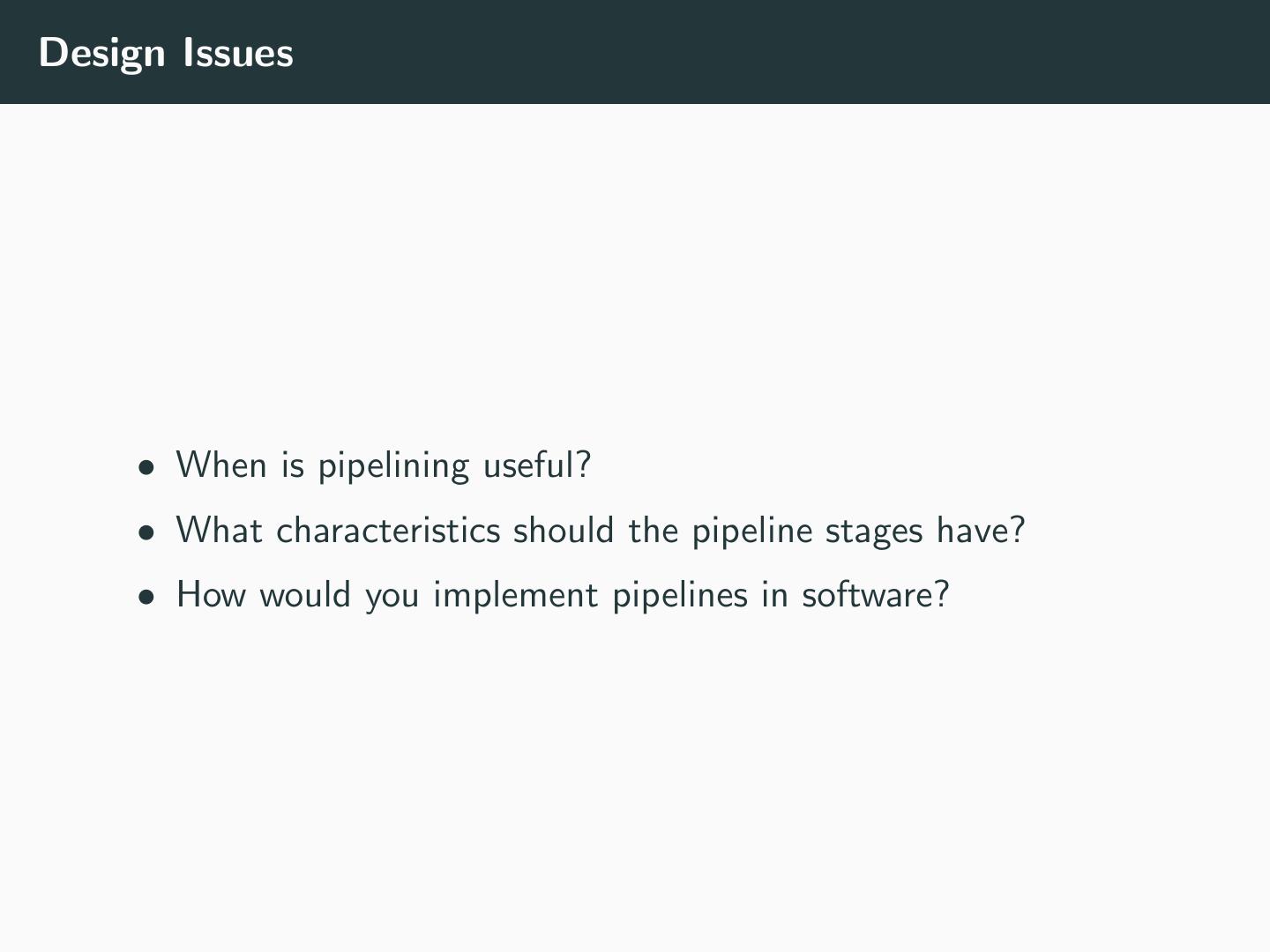 13 .Design Issues • When is pipelining useful? • What characteristics should the pipeline stages have? • How would you implement pipelines in software?