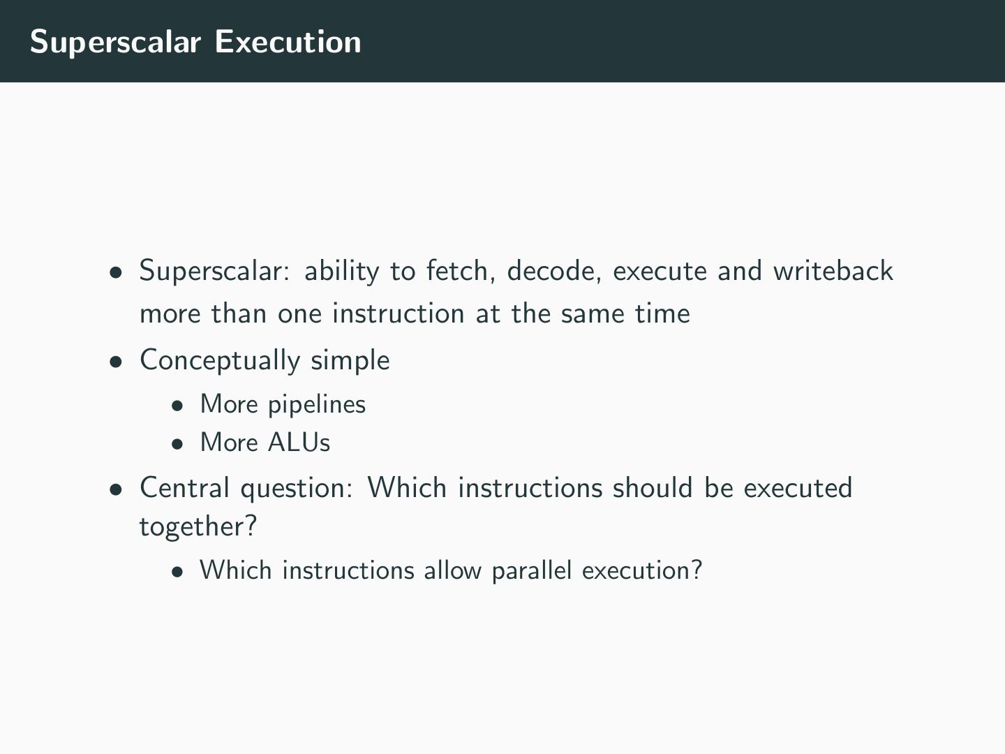 15 .Superscalar Execution • Superscalar: ability to fetch, decode, execute and writeback more than one instruction at the same time • Conceptually simple • More pipelines • More ALUs • Central question: Which instructions should be executed together? • Which instructions allow parallel execution?