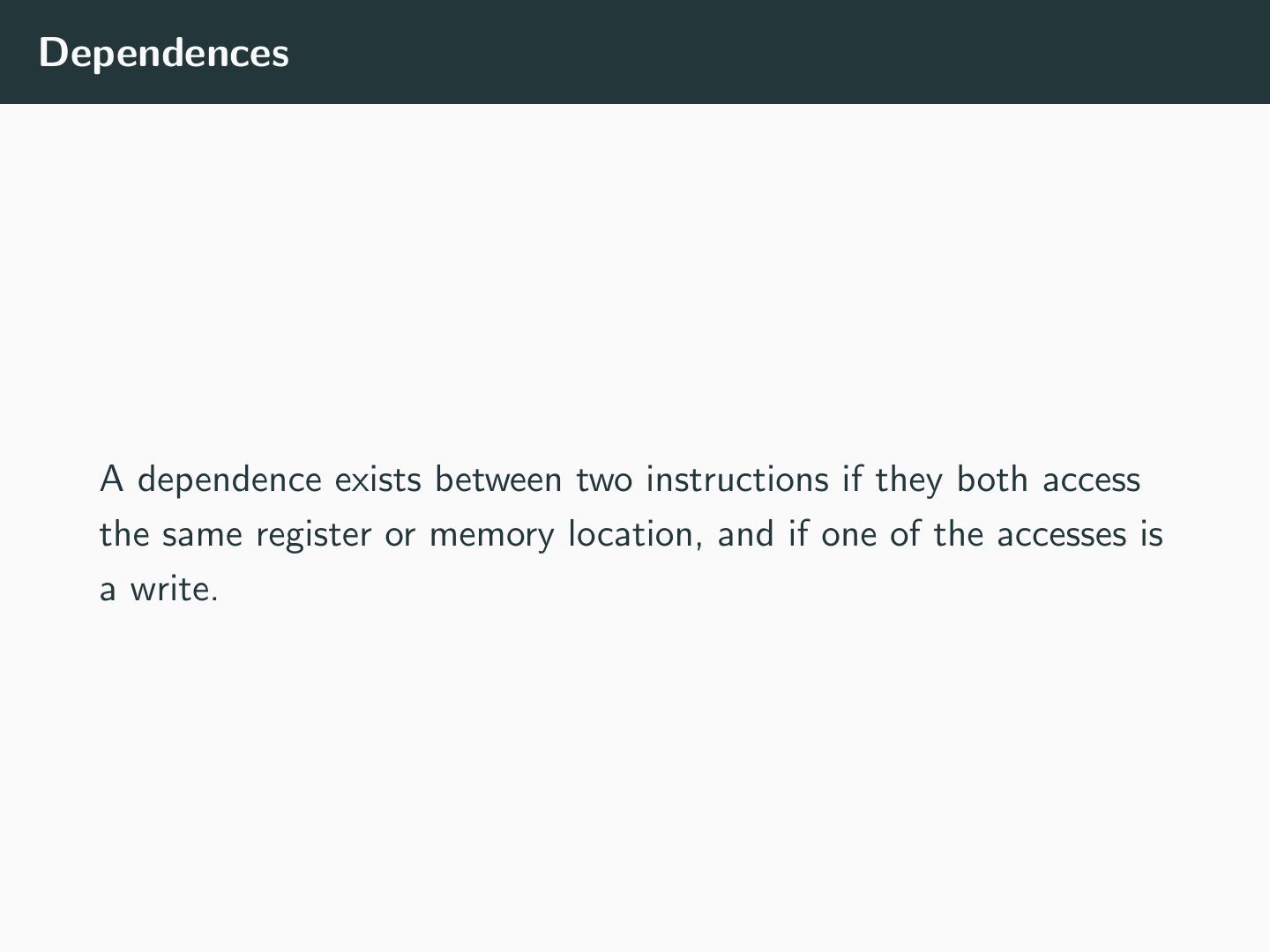 16 .Dependences A dependence exists between two instructions if they both access the same register or memory location, and if one of the accesses is a write.