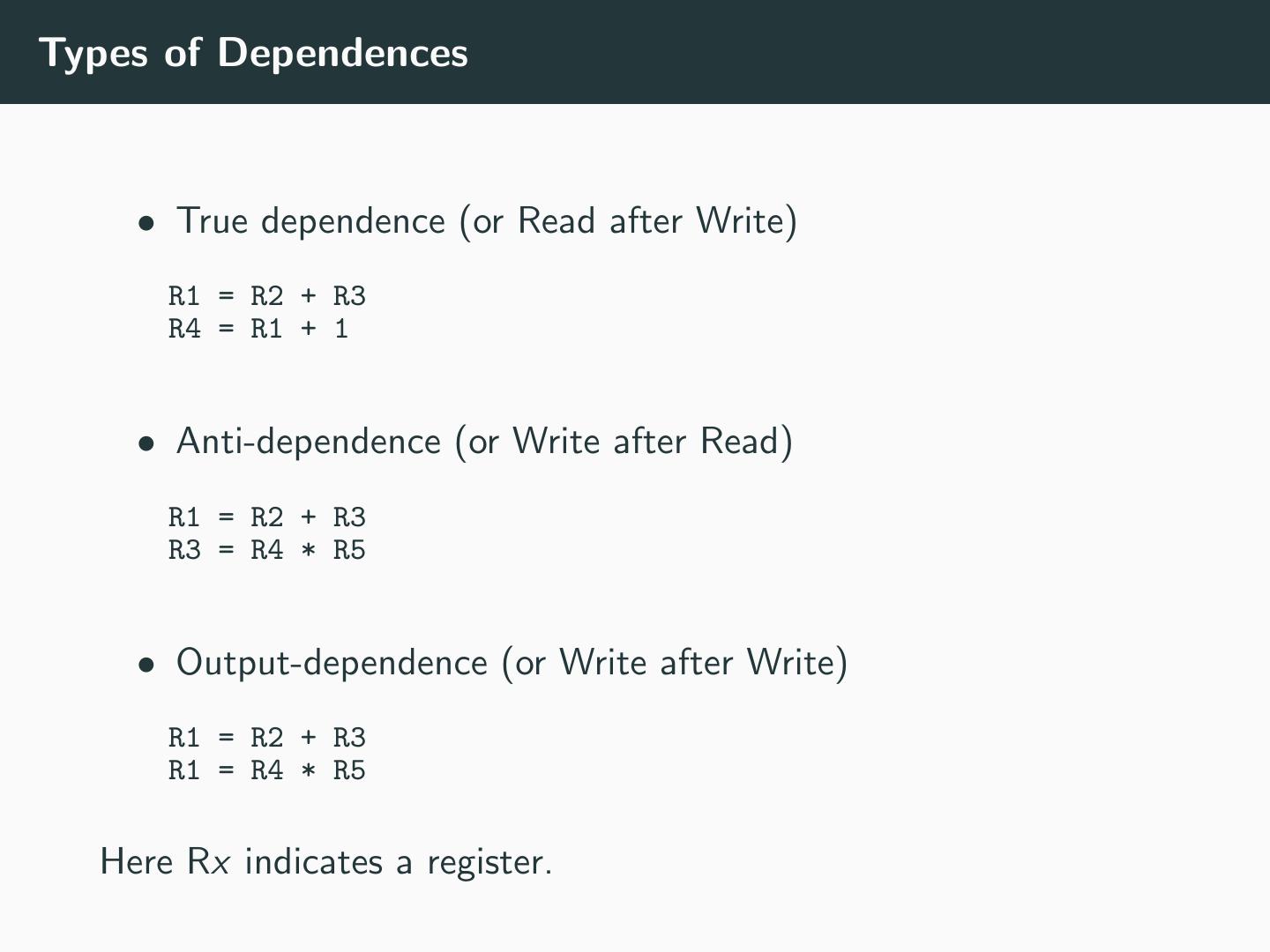 17 .Types of Dependences • True dependence (or Read after Write) R1 = R2 + R3 R4 = R1 + 1 • Anti-dependence (or Write after Read) R1 = R2 + R3 R3 = R4 * R5 • Output-dependence (or Write after Write) R1 = R2 + R3 R1 = R4 * R5 Here Rx indicates a register.