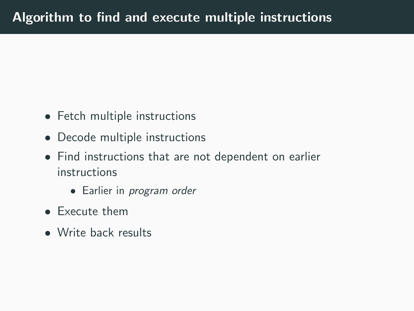 18 .Algorithm to find and execute multiple instructions • Fetch multiple instructions • Decode multiple instructions • Find instructions that are not dependent on earlier instructions • Earlier in program order • Execute them • Write back results