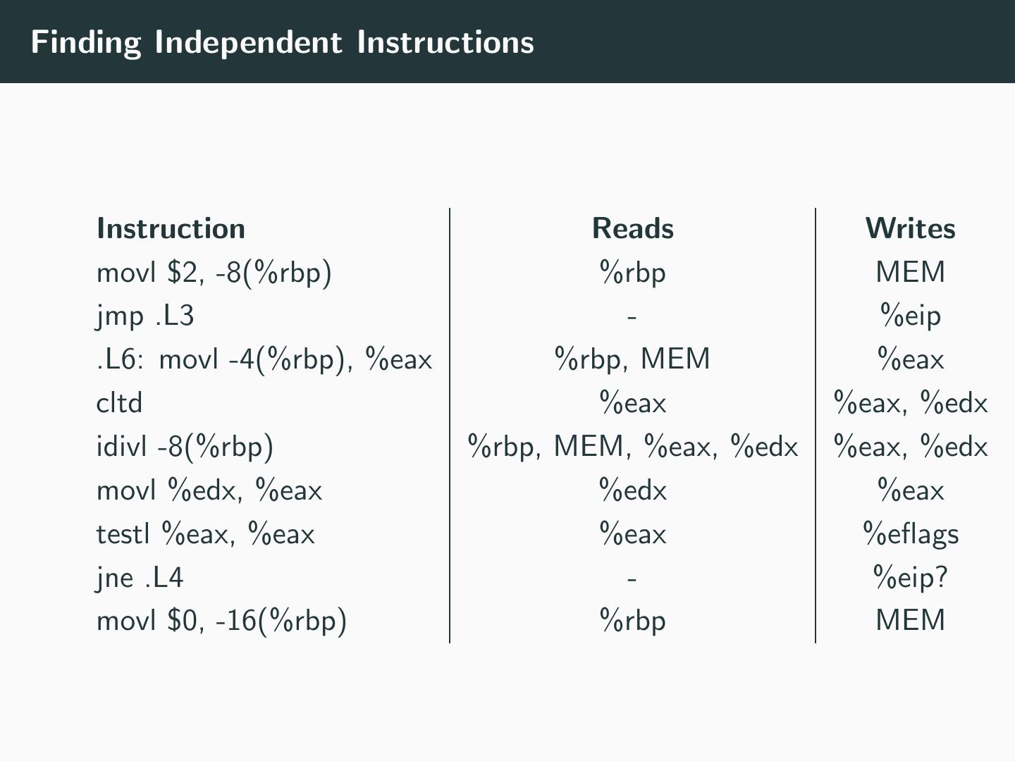 19 .Finding Independent Instructions Instruction Reads Writes movl $2, -8(%rbp) %rbp MEM jmp .L3 - %eip .L6: movl -4(%rbp), %eax %rbp, MEM %eax cltd %eax %eax, %edx idivl -8(%rbp) %rbp, MEM, %eax, %edx %eax, %edx movl %edx, %eax %edx %eax testl %eax, %eax %eax %eflags jne .L4 - %eip? movl $0, -16(%rbp) %rbp MEM