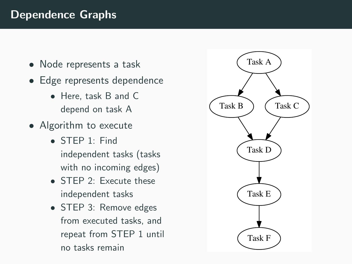 22 .Dependence Graphs • Node represents a task Task A • Edge represents dependence • Here, task B and C depend on task A Task B Task C • Algorithm to execute • STEP 1: Find Task D independent tasks (tasks with no incoming edges) • STEP 2: Execute these independent tasks Task E • STEP 3: Remove edges from executed tasks, and repeat from STEP 1 until Task F no tasks remain