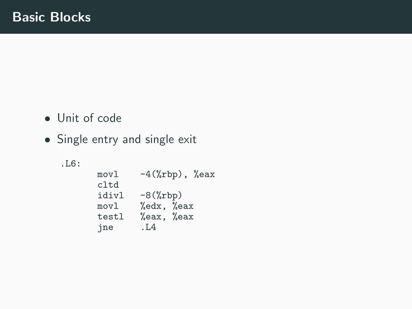 24 .Basic Blocks • Unit of code • Single entry and single exit .L6: movl -4(%rbp), %eax cltd idivl -8(%rbp) movl %edx, %eax testl %eax, %eax jne .L4