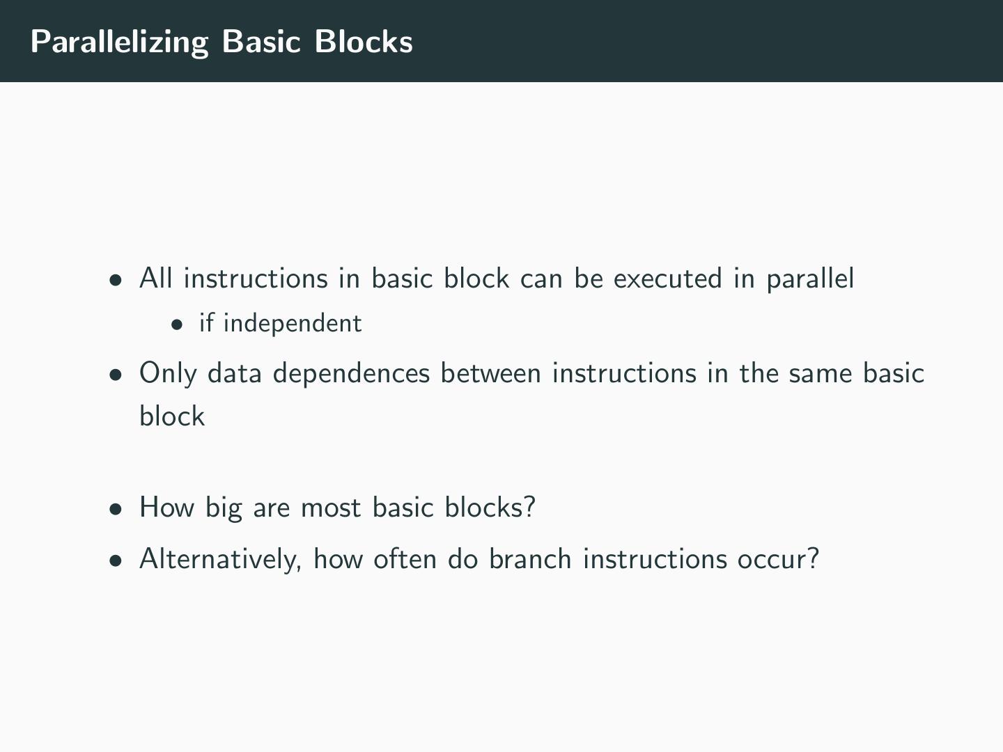 25 .Parallelizing Basic Blocks • All instructions in basic block can be executed in parallel • if independent • Only data dependences between instructions in the same basic block • How big are most basic blocks? • Alternatively, how often do branch instructions occur?