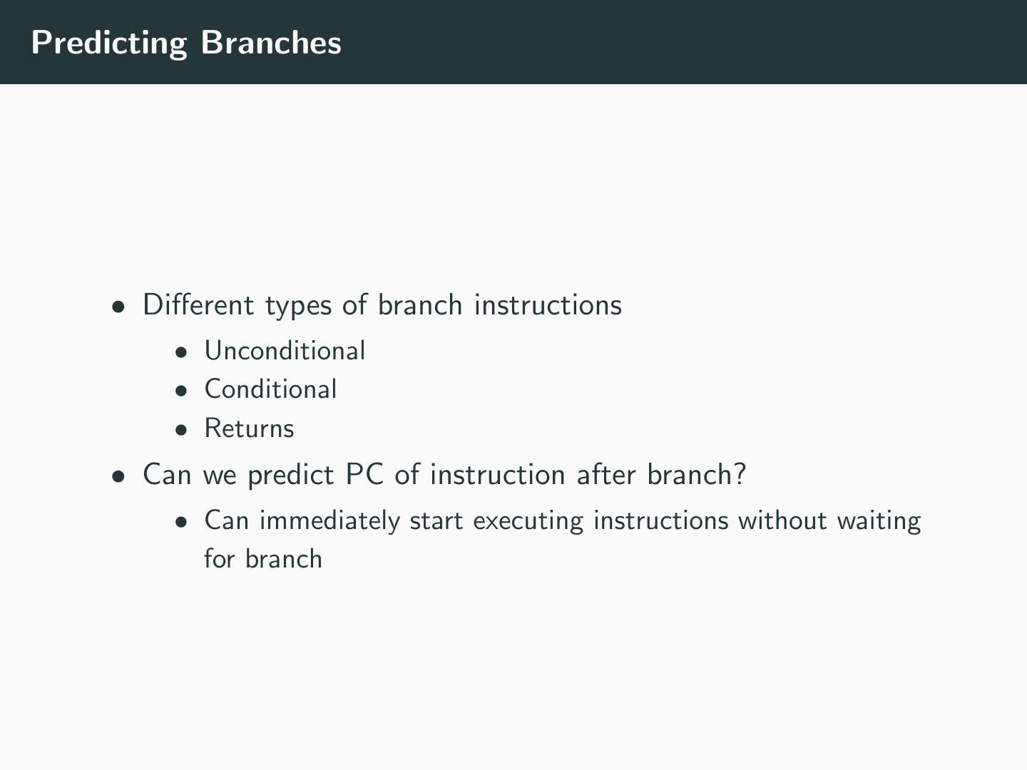 26 .Predicting Branches • Different types of branch instructions • Unconditional • Conditional • Returns • Can we predict PC of instruction after branch? • Can immediately start executing instructions without waiting for branch