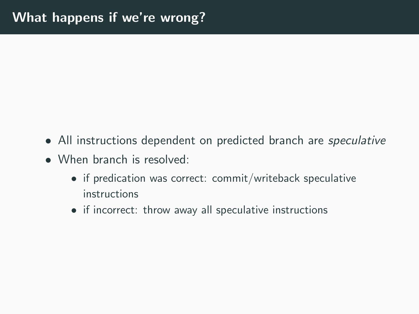 27 .What happens if we’re wrong? • All instructions dependent on predicted branch are speculative • When branch is resolved: • if predication was correct: commit/writeback speculative instructions • if incorrect: throw away all speculative instructions