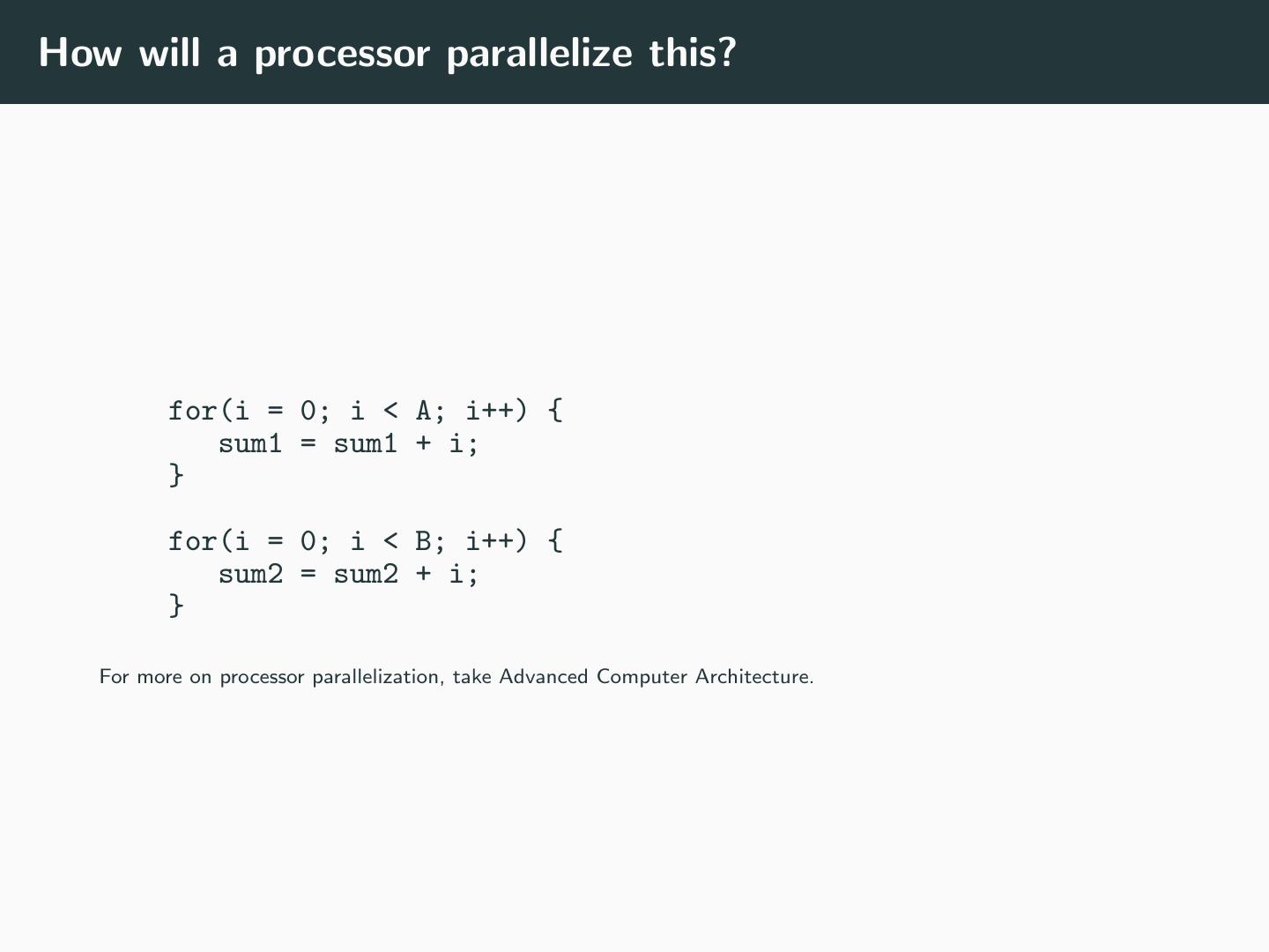 29 .How will a processor parallelize this? for(i = 0; i < A; i++) { sum1 = sum1 + i; } for(i = 0; i < B; i++) { sum2 = sum2 + i; } For more on processor parallelization, take Advanced Computer Architecture.
