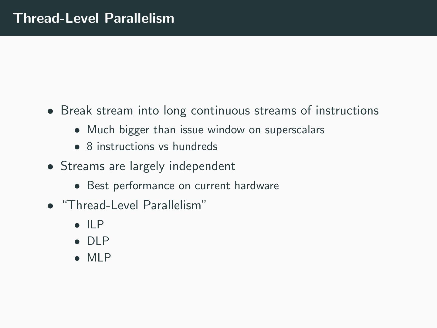 6 .Thread-Level Parallelism • Break stream into long continuous streams of instructions • Much bigger than issue window on superscalars • 8 instructions vs hundreds • Streams are largely independent • Best performance on current hardware • “Thread-Level Parallelism” • ILP • DLP • MLP