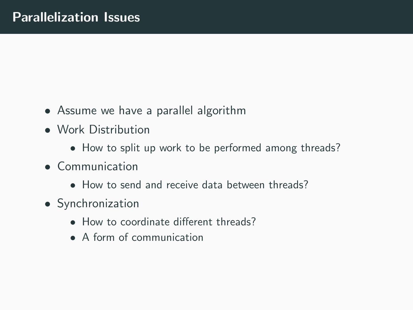 7 .Parallelization Issues • Assume we have a parallel algorithm • Work Distribution • How to split up work to be performed among threads? • Communication • How to send and receive data between threads? • Synchronization • How to coordinate different threads? • A form of communication