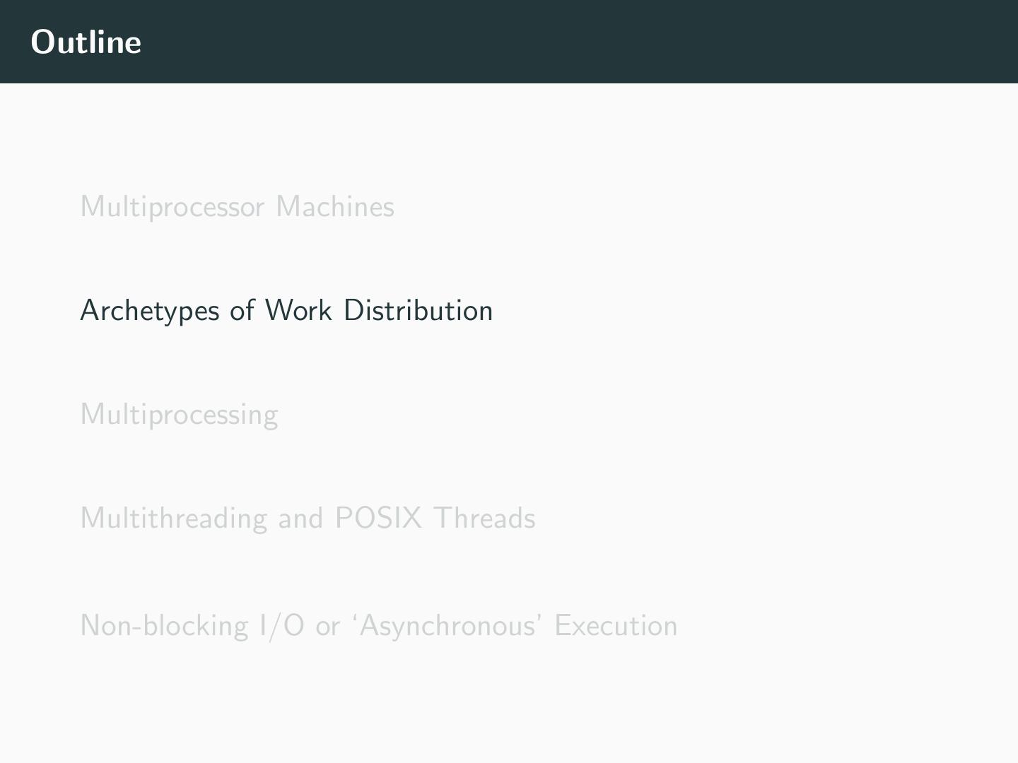 3 .Outline Multiprocessor Machines Archetypes of Work Distribution Multiprocessing Multithreading and POSIX Threads Non-blocking I/O or ‘Asynchronous’ Execution