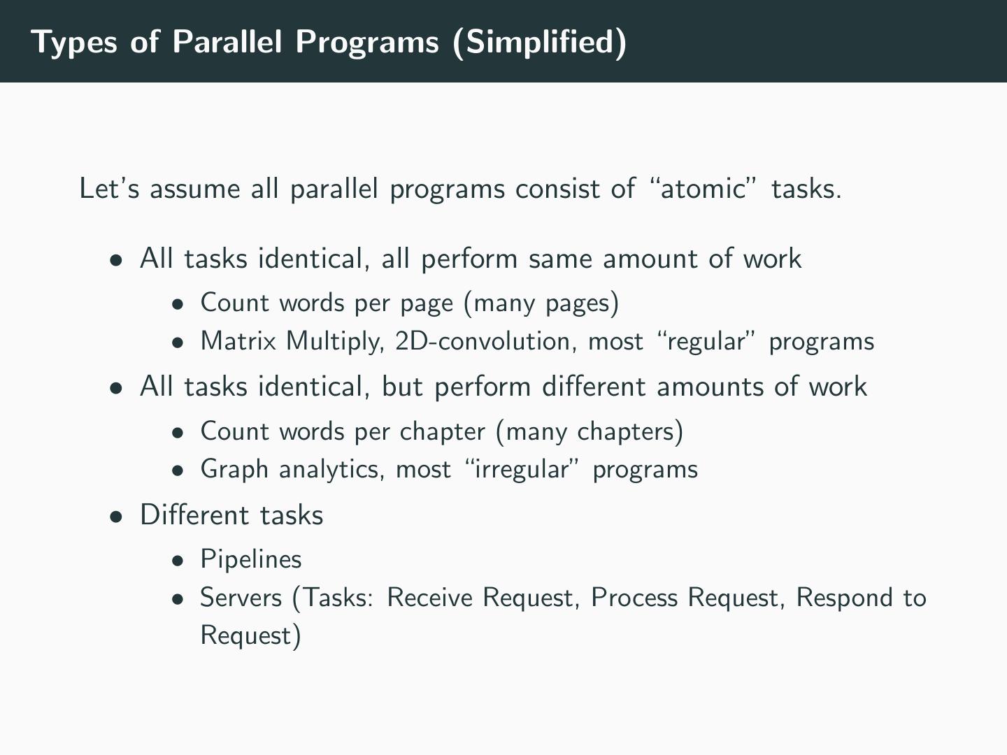 9 .Types of Parallel Programs (Simplified) Let’s assume all parallel programs consist of “atomic” tasks. • All tasks identical, all perform same amount of work • Count words per page (many pages) • Matrix Multiply, 2D-convolution, most “regular” programs • All tasks identical, but perform different amounts of work • Count words per chapter (many chapters) • Graph analytics, most “irregular” programs • Different tasks • Pipelines • Servers (Tasks: Receive Request, Process Request, Respond to Request)