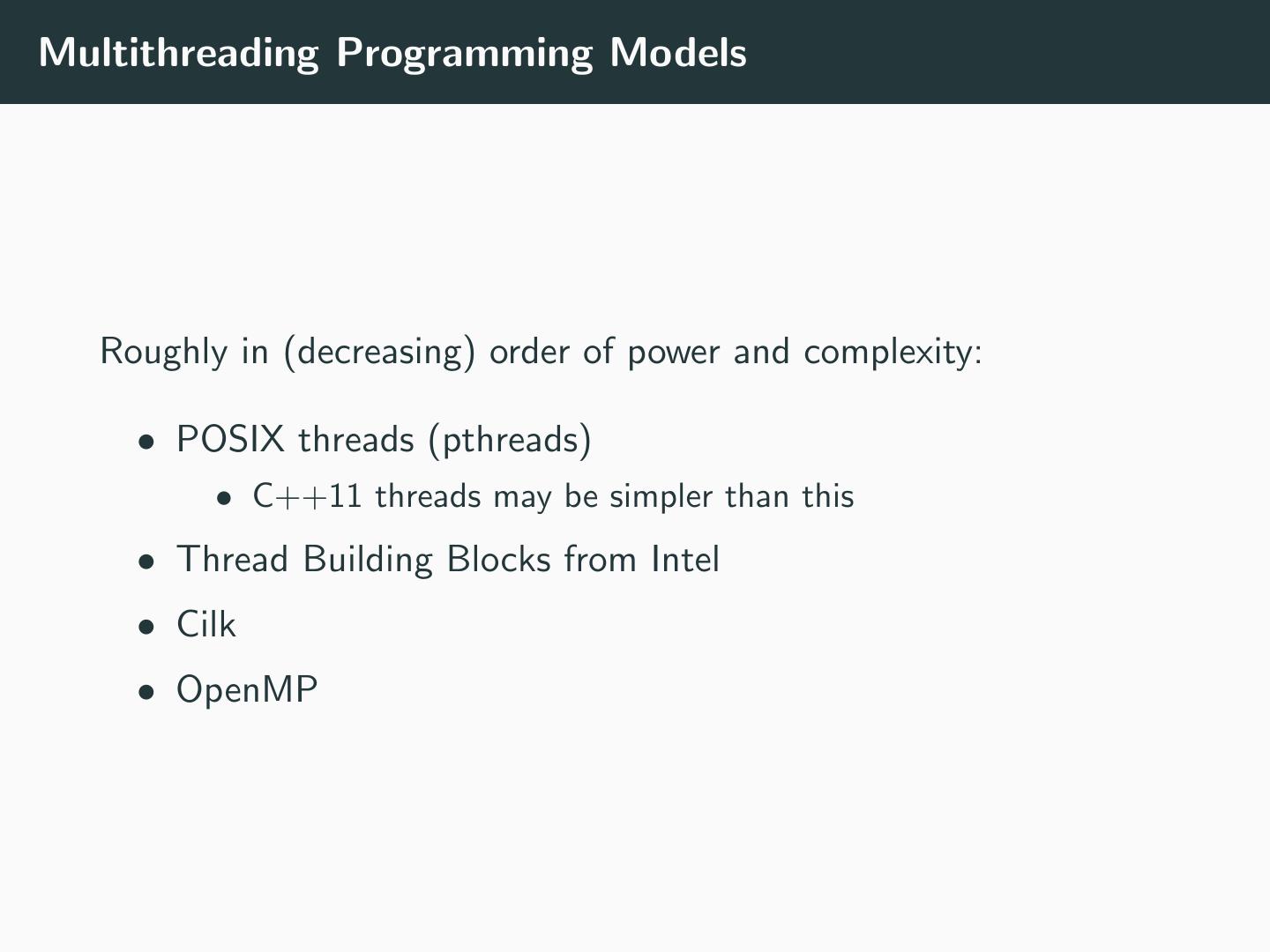 26 .Multithreading Programming Models Roughly in (decreasing) order of power and complexity: • POSIX threads (pthreads) • C++11 threads may be simpler than this • Thread Building Blocks from Intel • Cilk • OpenMP
