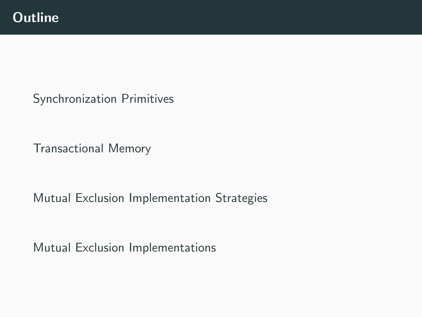 2 .Outline Synchronization Primitives Transactional Memory Mutual Exclusion Implementation Strategies Mutual Exclusion Implementations