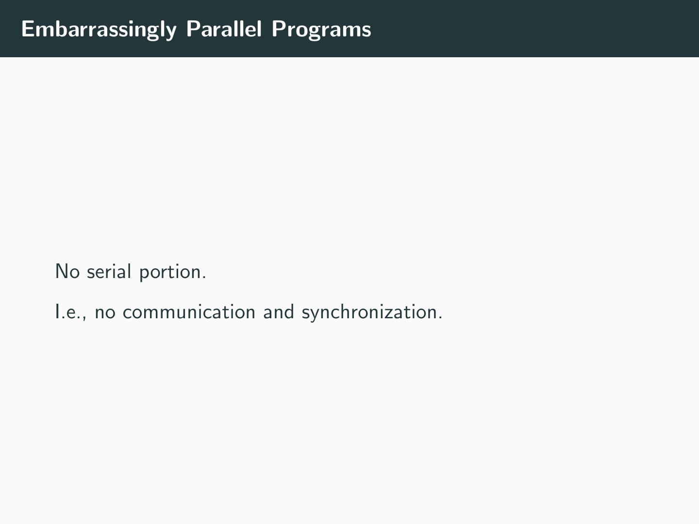 5 .Embarrassingly Parallel Programs No serial portion. I.e., no communication and synchronization.