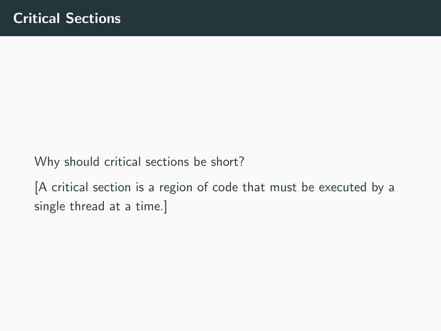 6 .Critical Sections Why should critical sections be short? [A critical section is a region of code that must be executed by a single thread at a time.]