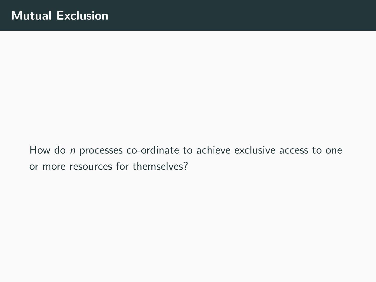 13 .Mutual Exclusion How do n processes co-ordinate to achieve exclusive access to one or more resources for themselves?