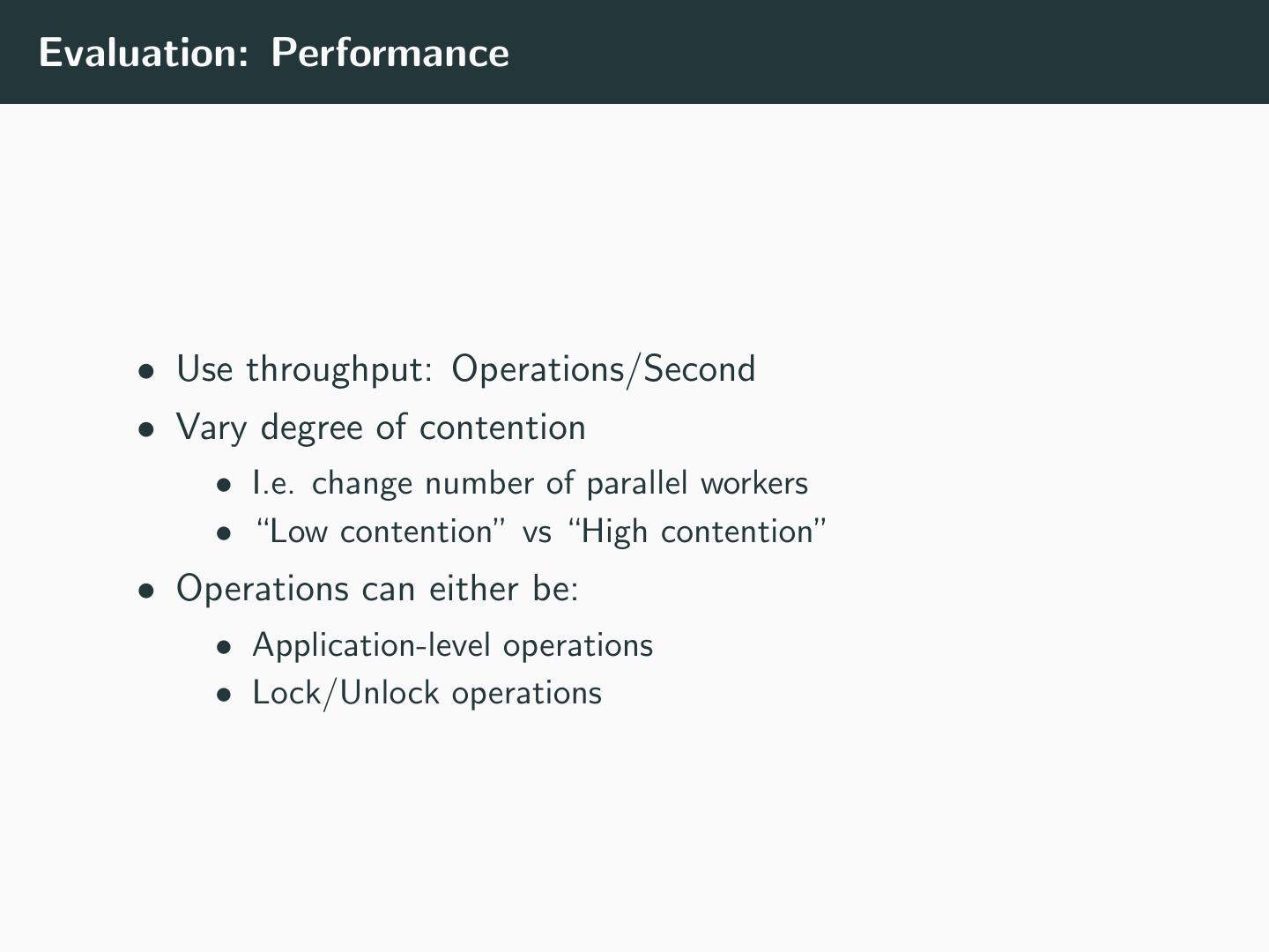 17 .Evaluation: Performance • Use throughput: Operations/Second • Vary degree of contention • I.e. change number of parallel workers • “Low contention” vs “High contention” • Operations can either be: • Application-level operations • Lock/Unlock operations