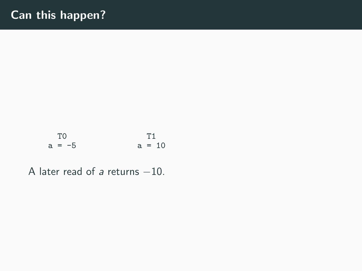 24 .Can this happen? T0 T1 a = -5 a = 10 A later read of a returns −10.