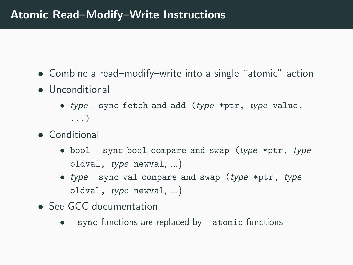27 .Atomic Read–Modify–Write Instructions • Combine a read–modify–write into a single “atomic” action • Unconditional • type sync fetch and add (type *ptr, type value, ...) • Conditional • bool sync bool compare and swap (type *ptr, type oldval, type newval, ...) • type sync val compare and swap (type *ptr, type oldval, type newval, ...) • See GCC documentation • sync functions are replaced by atomic functions