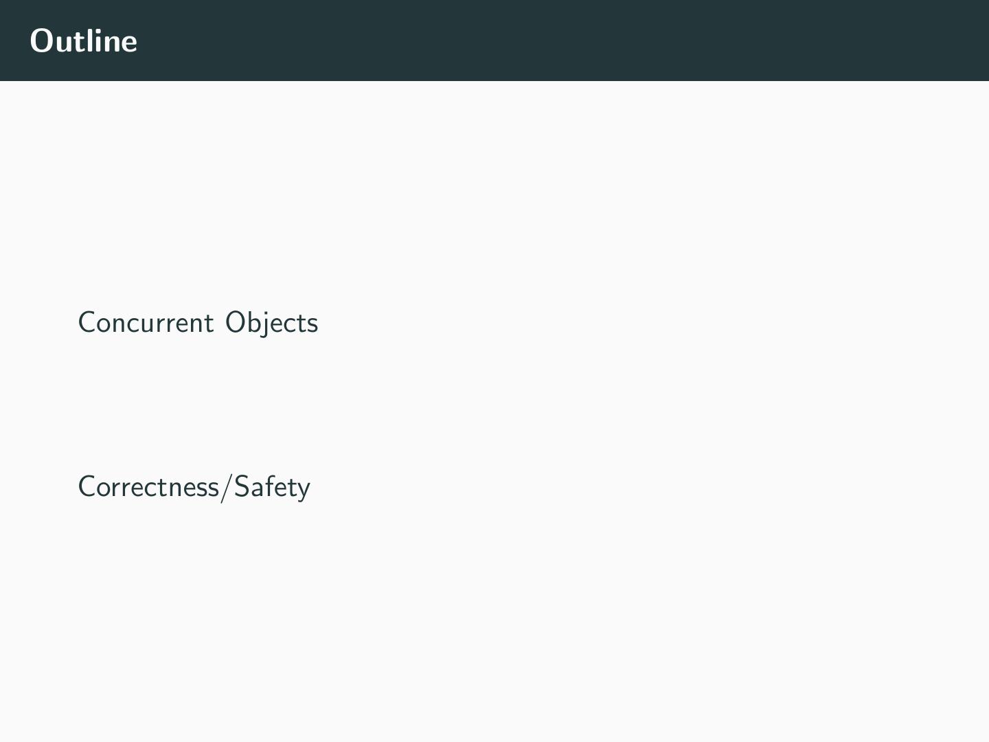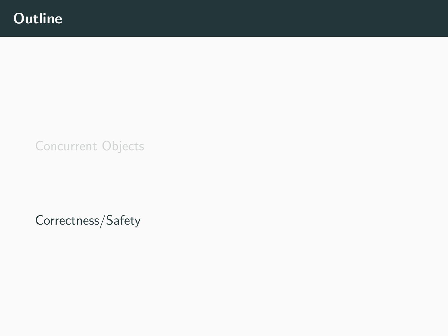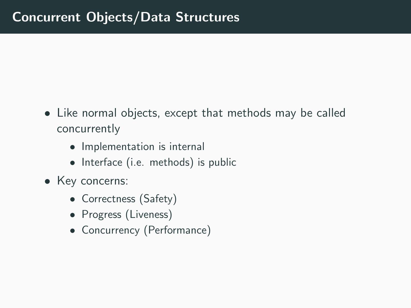 4 .Concurrent Objects/Data Structures • Like normal objects, except that methods may be called concurrently • Implementation is internal • Interface (i.e. methods) is public • Key concerns: • Correctness (Safety) • Progress (Liveness) • Concurrency (Performance)