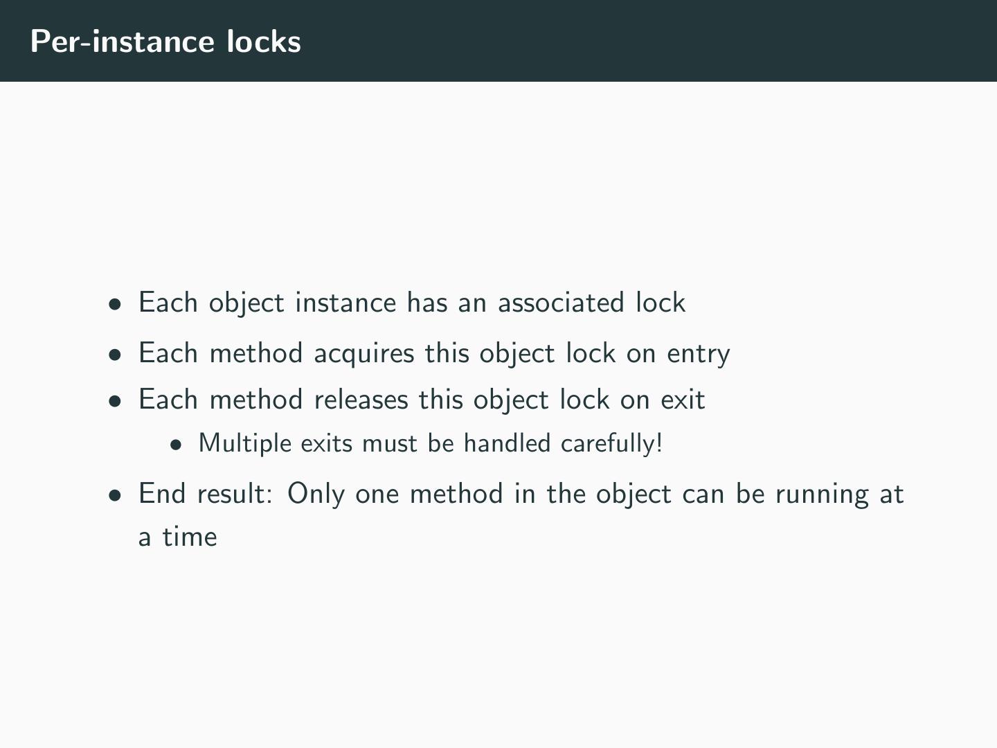 5 .Per-instance locks • Each object instance has an associated lock • Each method acquires this object lock on entry • Each method releases this object lock on exit • Multiple exits must be handled carefully! • End result: Only one method in the object can be running at a time