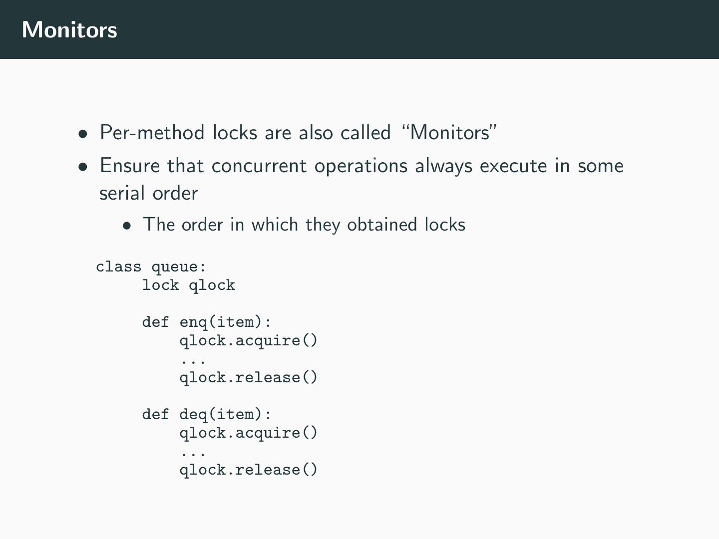 6 .Monitors • Per-method locks are also called “Monitors” • Ensure that concurrent operations always execute in some serial order • The order in which they obtained locks class queue: lock qlock def enq(item): qlock.acquire() ... qlock.release() def deq(item): qlock.acquire() ... qlock.release()