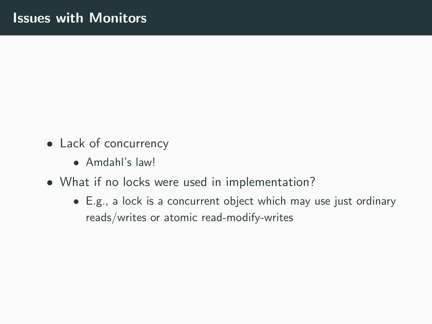 7 .Issues with Monitors • Lack of concurrency • Amdahl’s law! • What if no locks were used in implementation? • E.g., a lock is a concurrent object which may use just ordinary reads/writes or atomic read-modify-writes