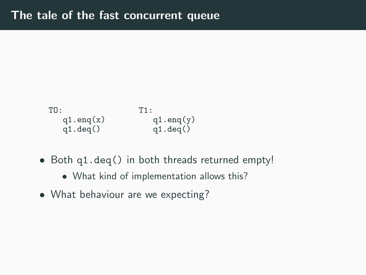 9 .The tale of the fast concurrent queue TO: T1: q1.enq(x) q1.enq(y) q1.deq() q1.deq() • Both q1.deq() in both threads returned empty! • What kind of implementation allows this? • What behaviour are we expecting?