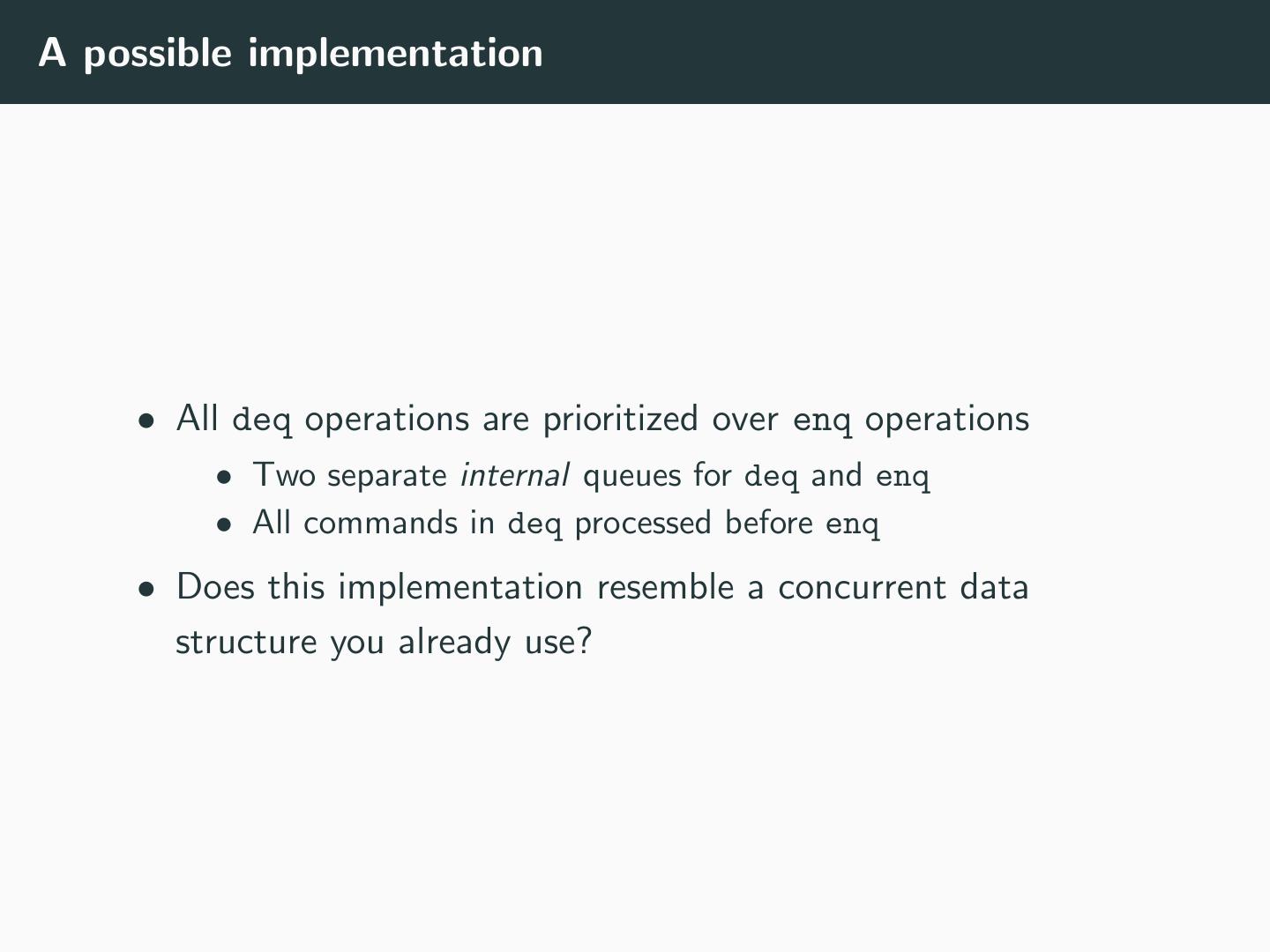 10 .A possible implementation • All deq operations are prioritized over enq operations • Two separate internal queues for deq and enq • All commands in deq processed before enq • Does this implementation resemble a concurrent data structure you already use?