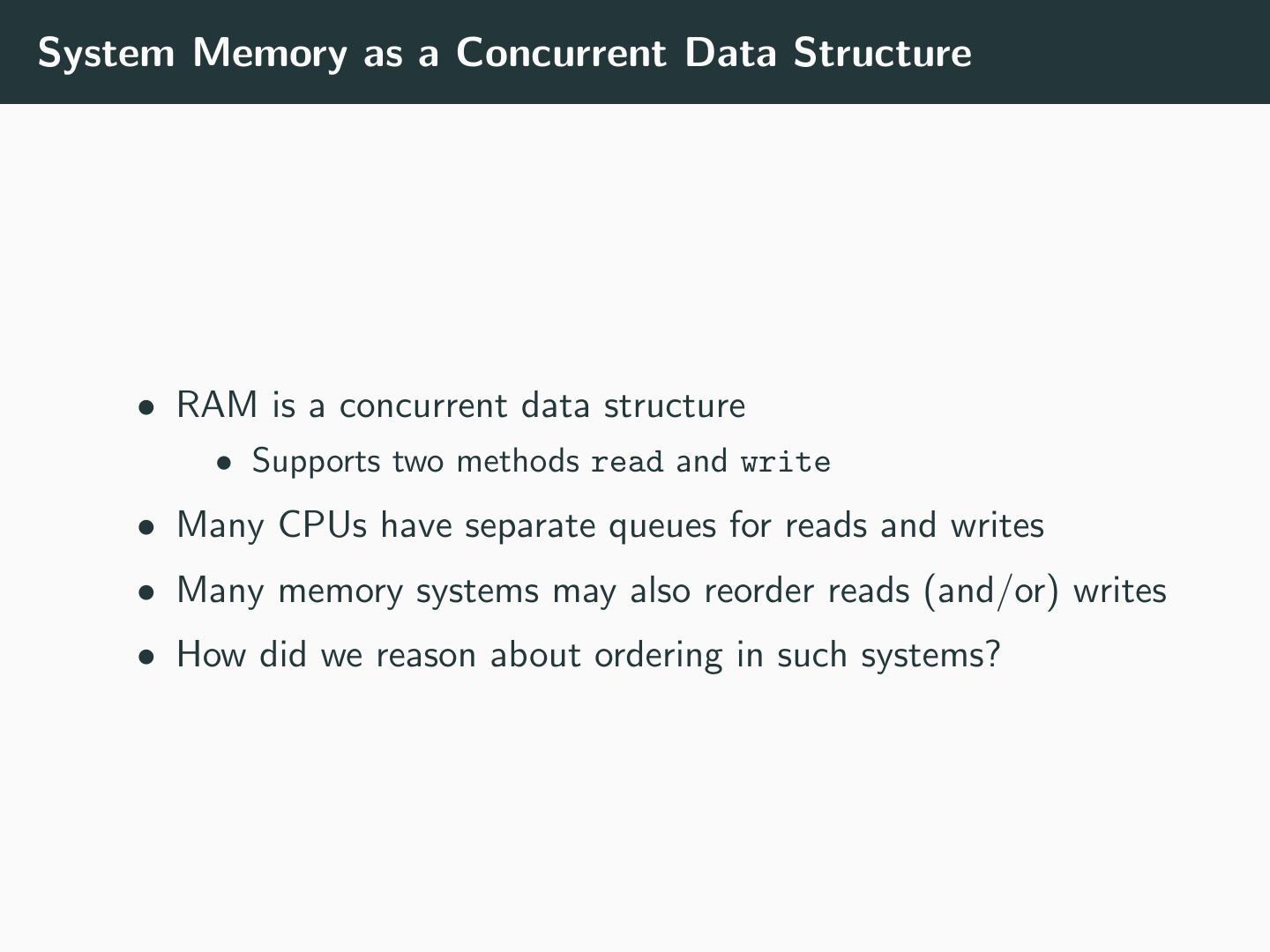 11 .System Memory as a Concurrent Data Structure • RAM is a concurrent data structure • Supports two methods read and write • Many CPUs have separate queues for reads and writes • Many memory systems may also reorder reads (and/or) writes • How did we reason about ordering in such systems?