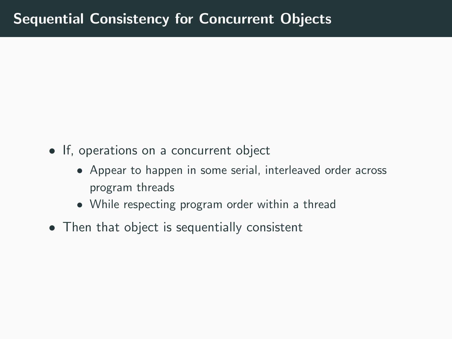 12 .Sequential Consistency for Concurrent Objects • If, operations on a concurrent object • Appear to happen in some serial, interleaved order across program threads • While respecting program order within a thread • Then that object is sequentially consistent