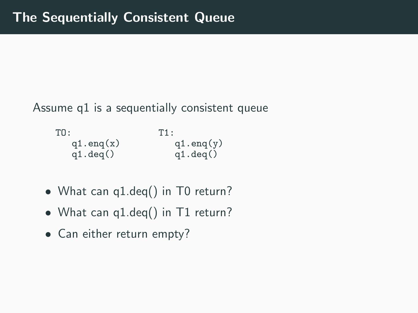 13 .The Sequentially Consistent Queue Assume q1 is a sequentially consistent queue TO: T1: q1.enq(x) q1.enq(y) q1.deq() q1.deq() • What can q1.deq() in T0 return? • What can q1.deq() in T1 return? • Can either return empty?