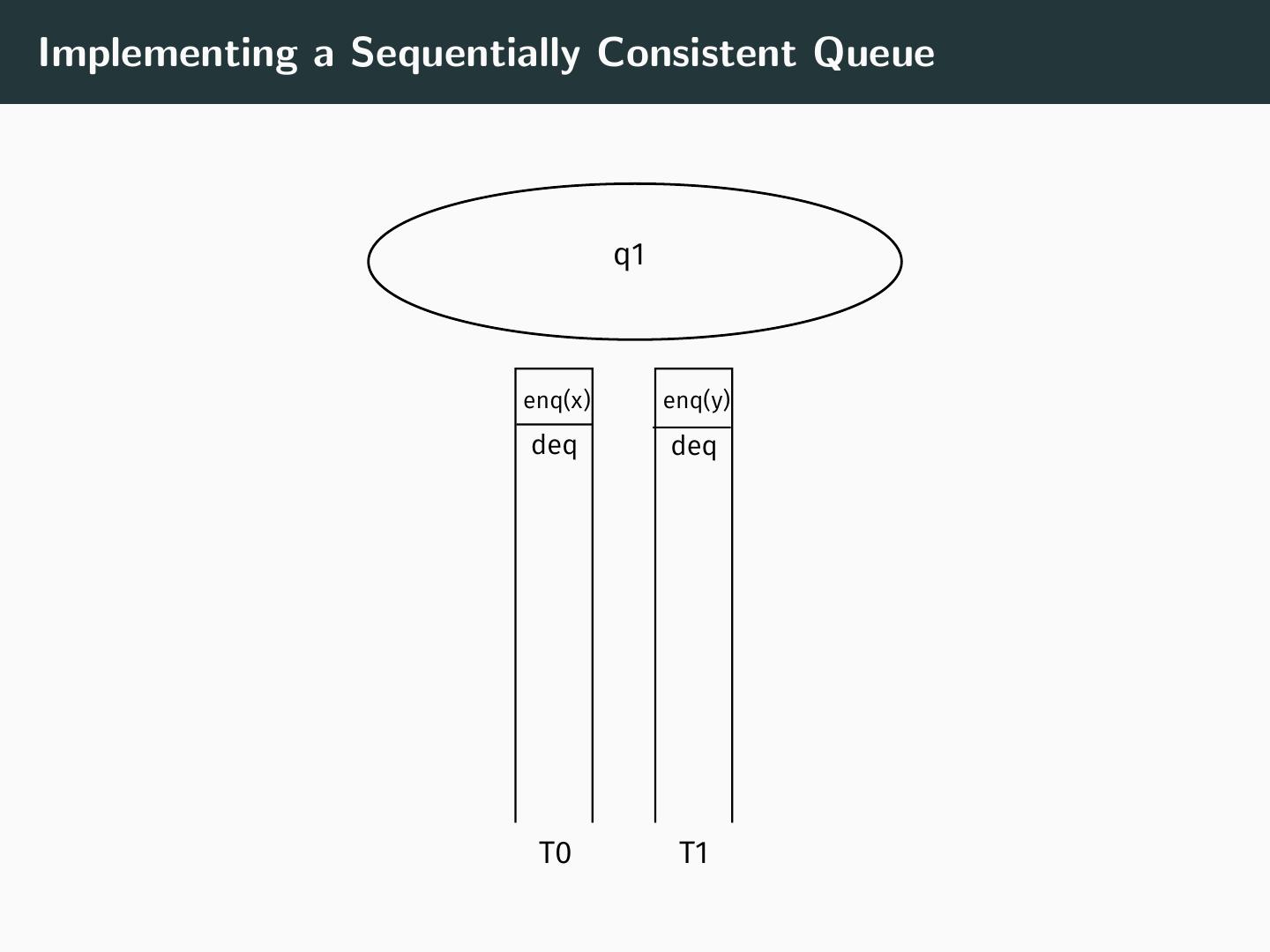 14 .Implementing a Sequentially Consistent Queue q1 enq(x) enq(y) deq deq T0 T1
