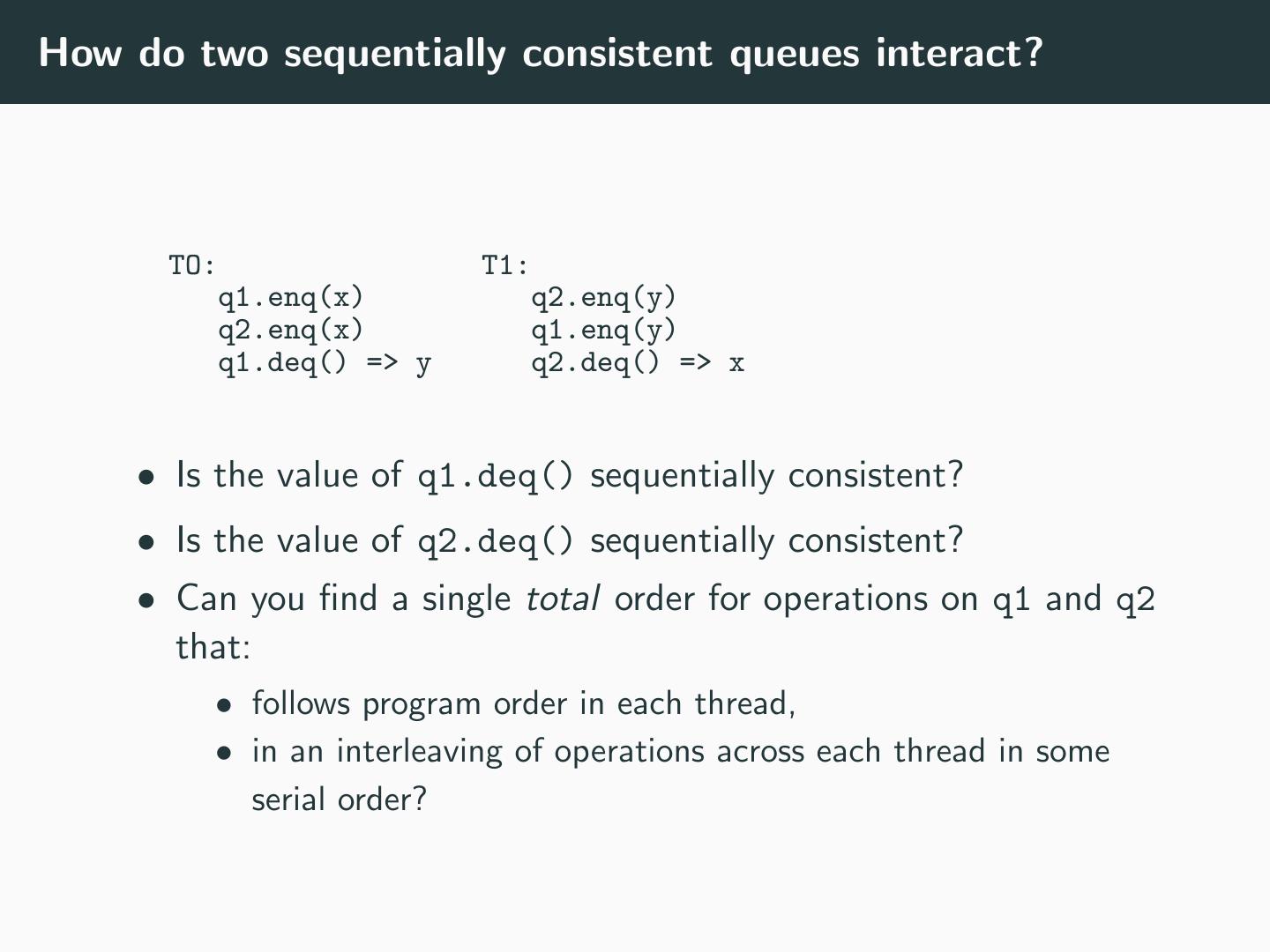 15 .How do two sequentially consistent queues interact? TO: T1: q1.enq(x) q2.enq(y) q2.enq(x) q1.enq(y) q1.deq() => y q2.deq() => x • Is the value of q1.deq() sequentially consistent? • Is the value of q2.deq() sequentially consistent? • Can you find a single total order for operations on q1 and q2 that: • follows program order in each thread, • in an interleaving of operations across each thread in some serial order?