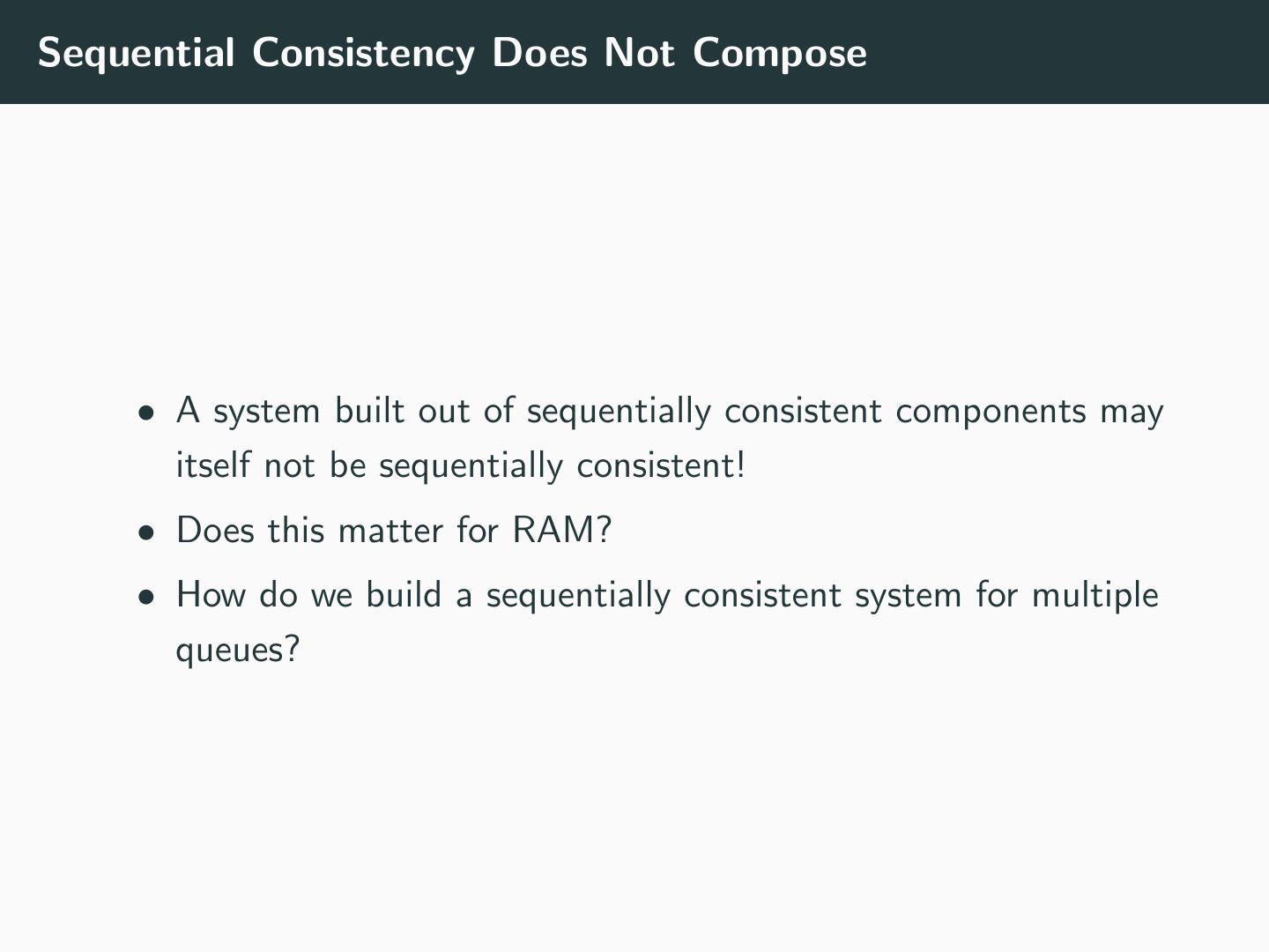 17 .Sequential Consistency Does Not Compose • A system built out of sequentially consistent components may itself not be sequentially consistent! • Does this matter for RAM? • How do we build a sequentially consistent system for multiple queues?