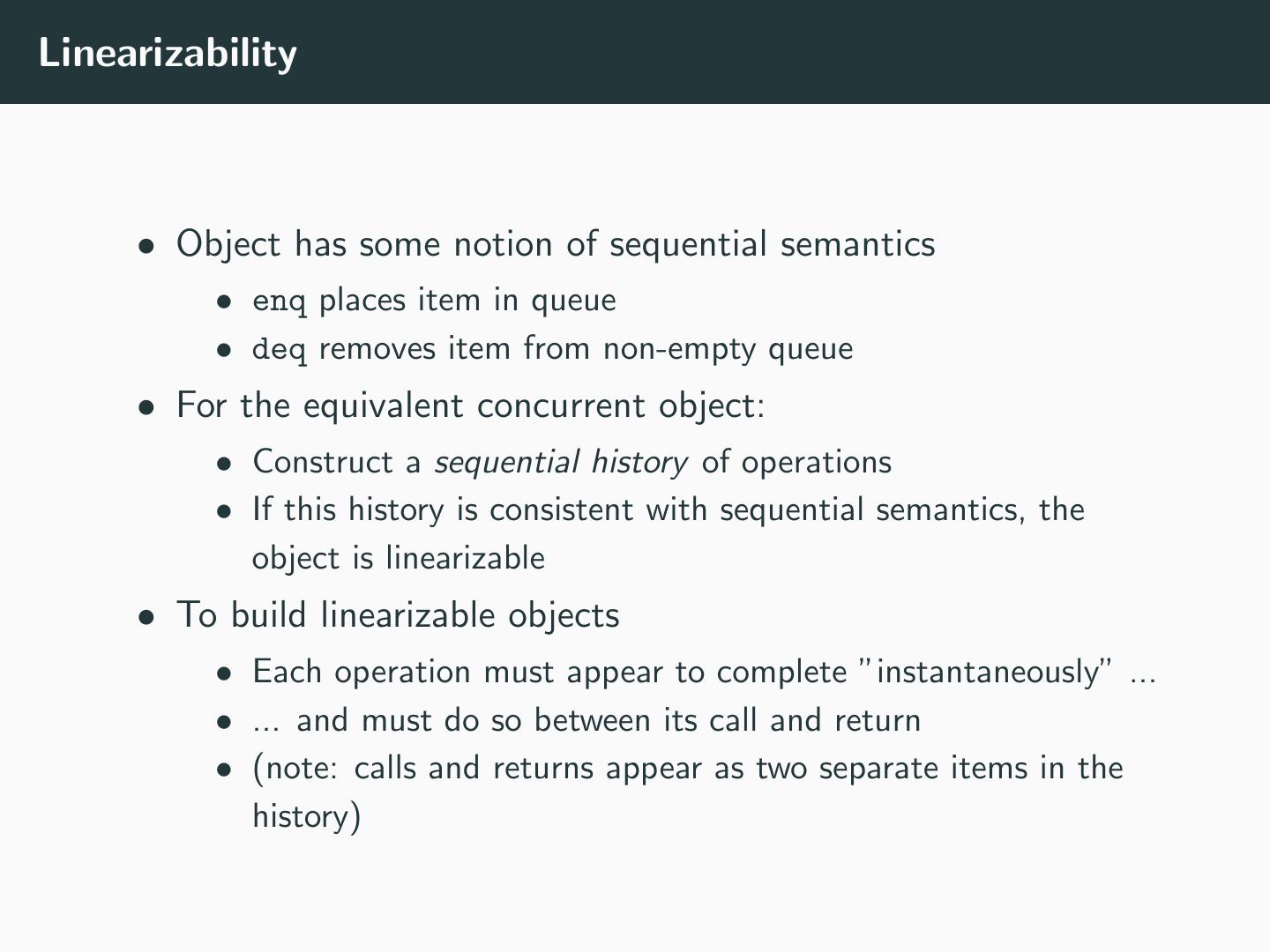 18 .Linearizability • Object has some notion of sequential semantics • enq places item in queue • deq removes item from non-empty queue • For the equivalent concurrent object: • Construct a sequential history of operations • If this history is consistent with sequential semantics, the object is linearizable • To build linearizable objects • Each operation must appear to complete ”instantaneously” ... • ... and must do so between its call and return • (note: calls and returns appear as two separate items in the history)