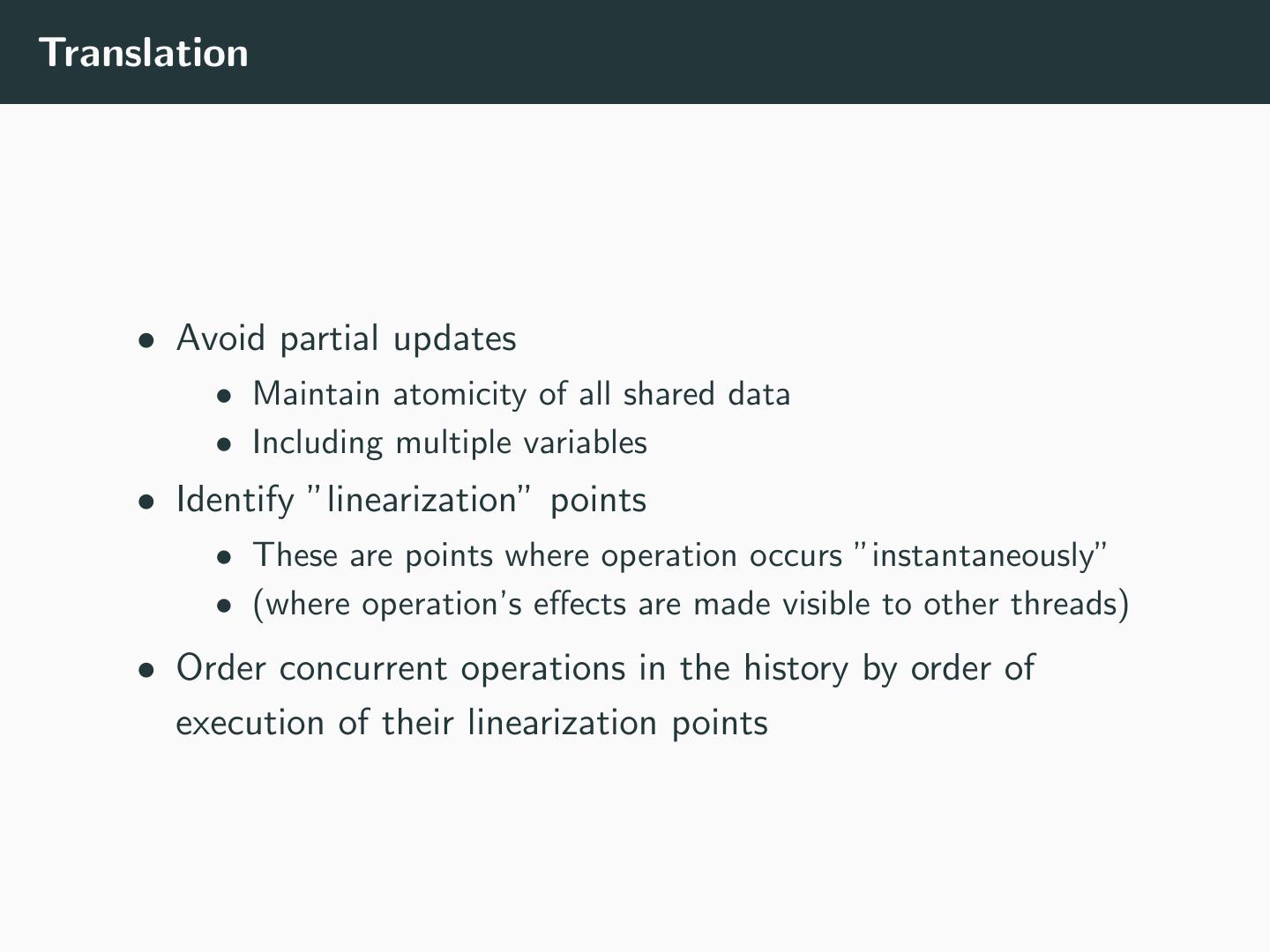 19 .Translation • Avoid partial updates • Maintain atomicity of all shared data • Including multiple variables • Identify ”linearization” points • These are points where operation occurs ”instantaneously” • (where operation’s effects are made visible to other threads) • Order concurrent operations in the history by order of execution of their linearization points